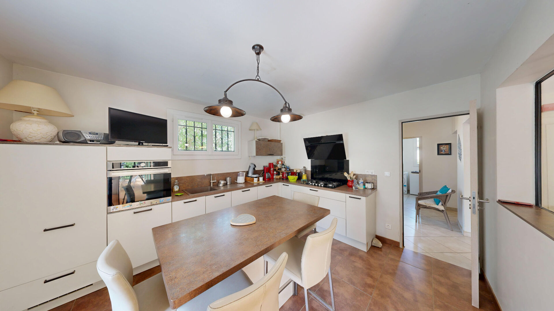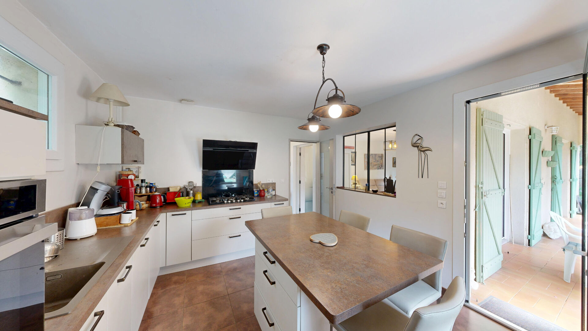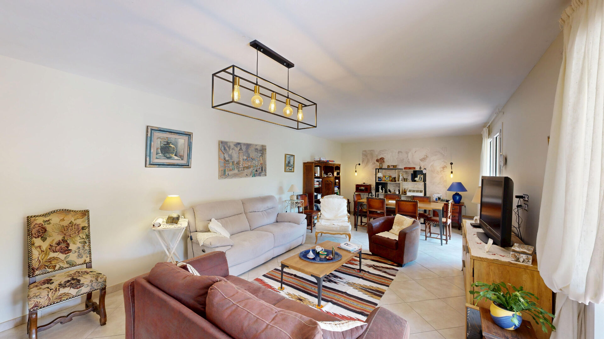 Côté intérieur, la maison offre un bel espace de vie avec un salon séjour lumineux ouvrant directement sur la terrasse et la piscine.