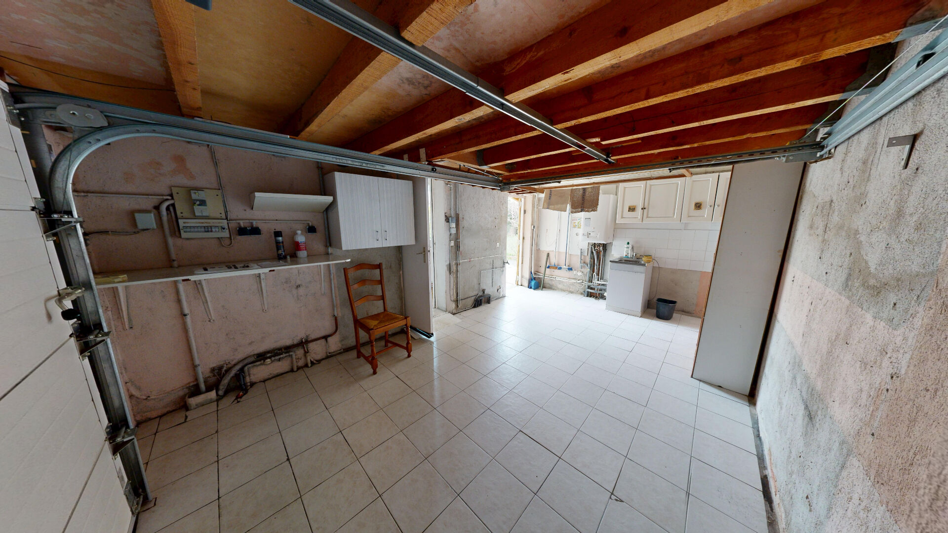La maison dispose d'une cuisine fonctionnelle, avec un accès direct au garage. Ce dernier bénéficie également d'un second accès extérieur à l'arrière de la maison, un véritable atout au quotidien.