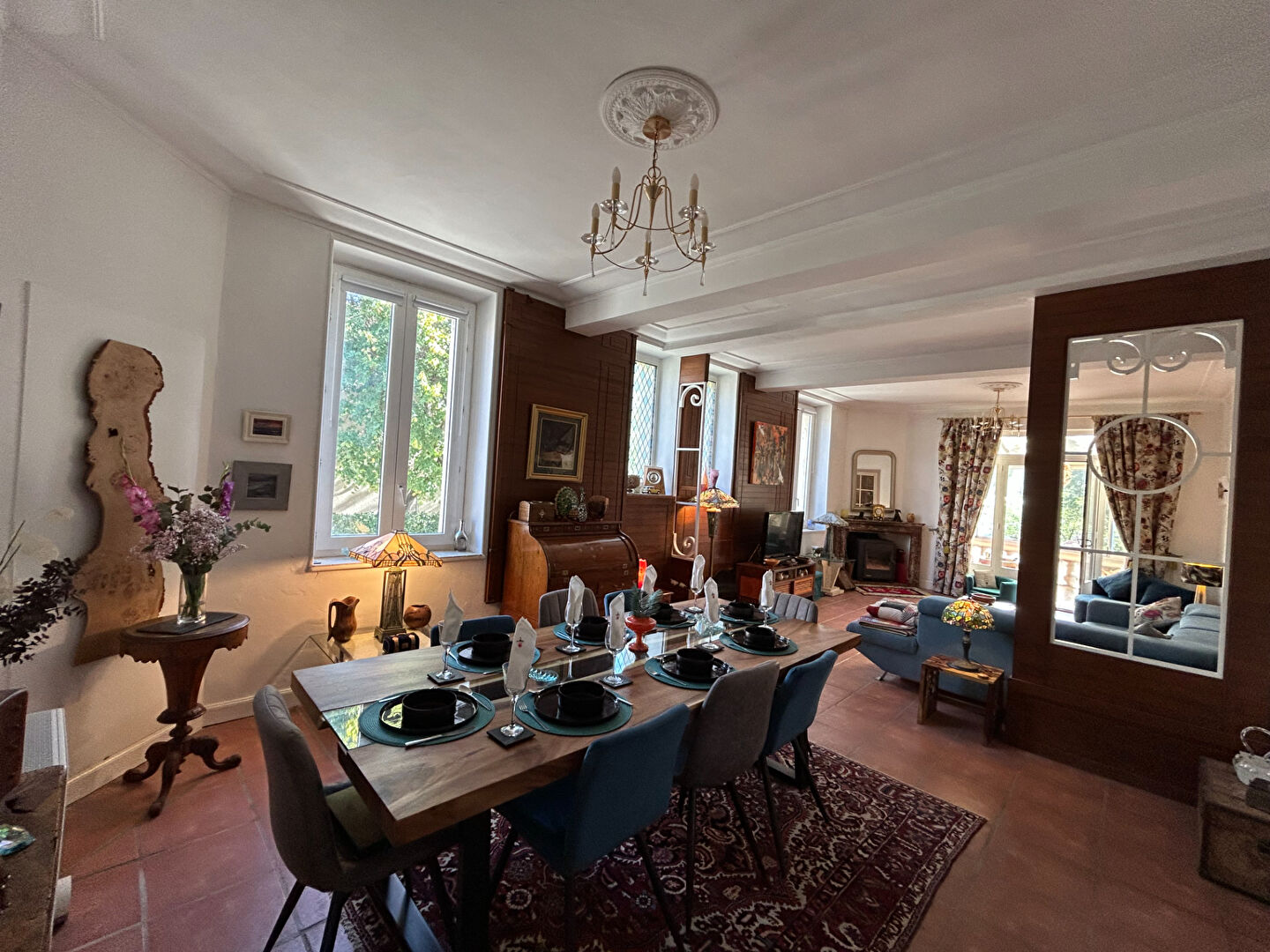 Une véranda/jardin d'hiver complète cet espace de vie, offrant une atmosphère paisible et un lien harmonieux entre intérieur et extérieur.