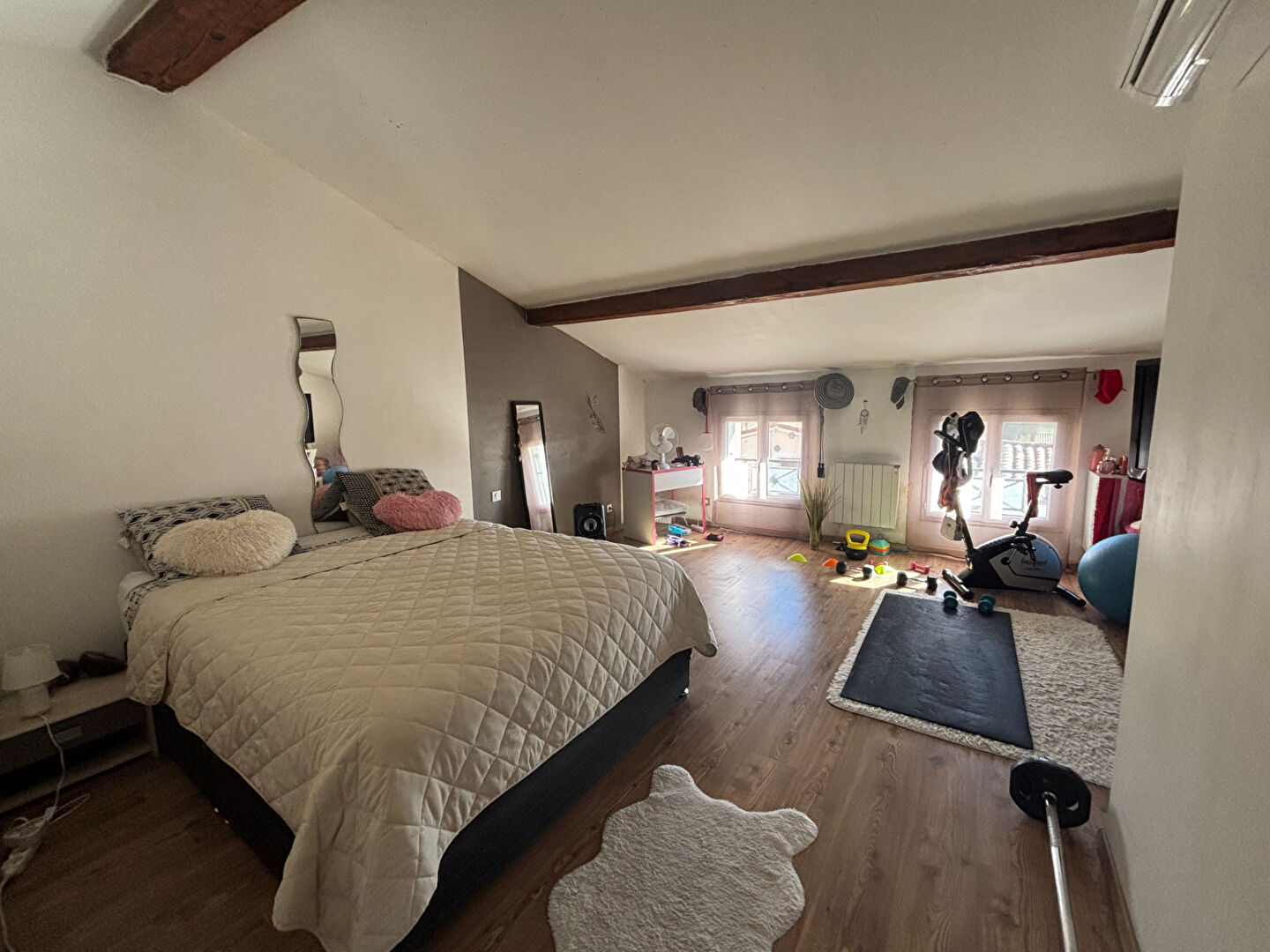 Et pour finir en beauté, le dernier étage réserve une magnifique suite parentale de plus de 40 m². Un espace à part, intime et raffiné, où se mêlent charme, poutres apparentes, dressing et salle d'eau privative.