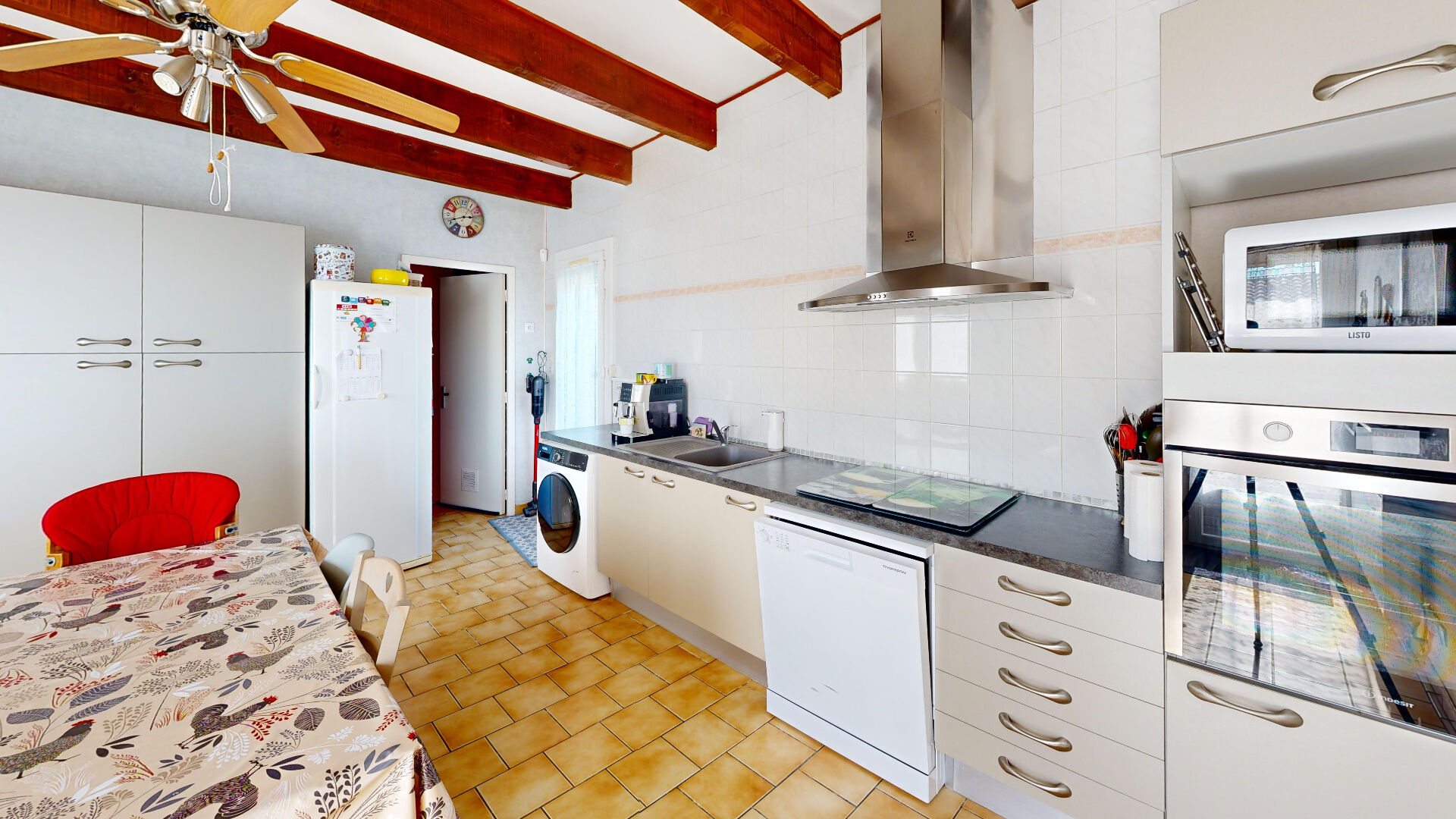 Dès l'entrée, vous découvrez une agréable pièce de vie lumineuse comprenant un séjour et une salle à manger. La grande cuisine, spacieuse et pratique, permet d'imaginer facilement des instants de convivialité.