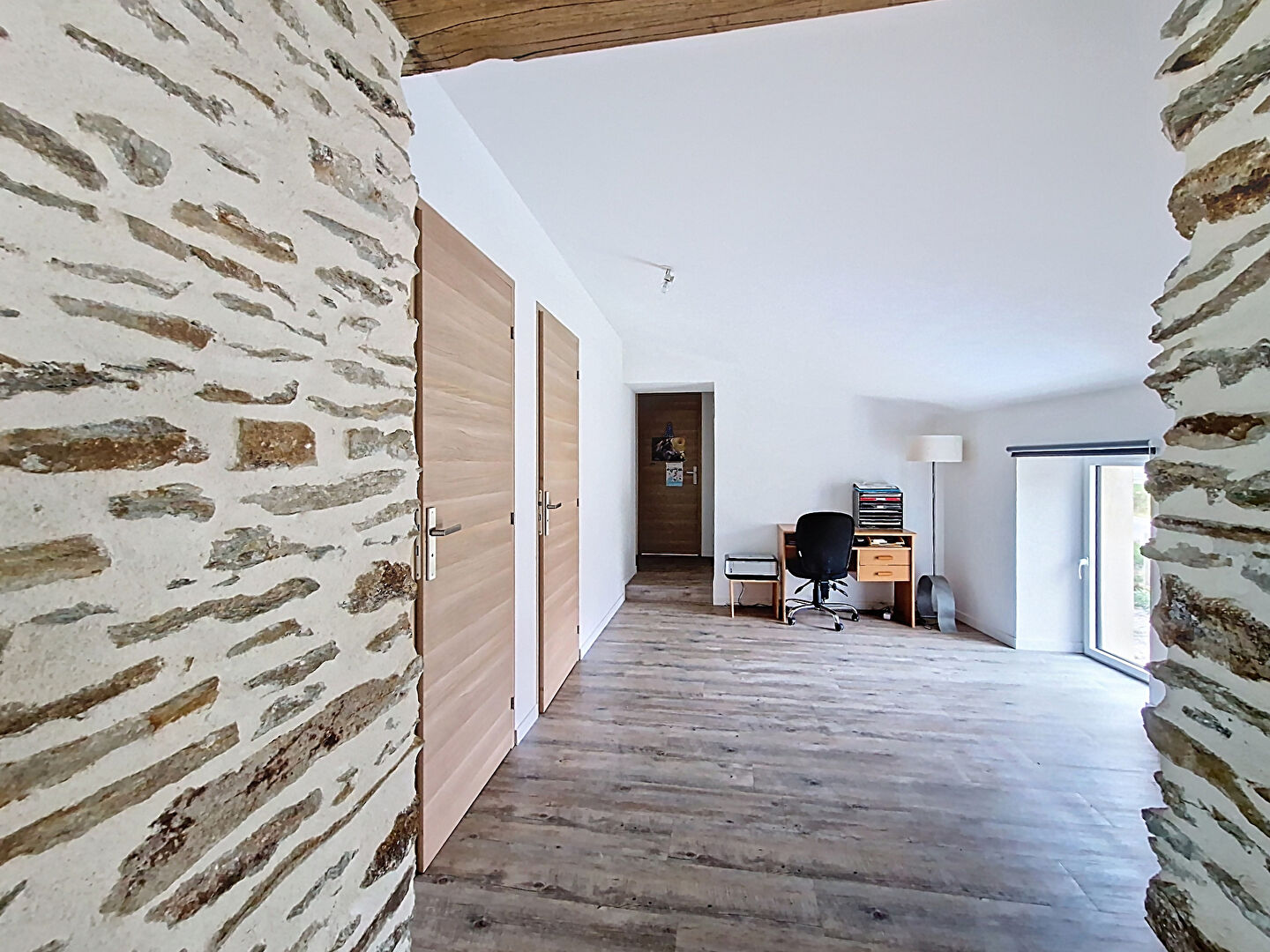 Laissez-vous séduire par cette magnifique longère rénovée d'environ 160 m² habitables, nichée au calme d'un hameau, où le mariage harmonieux de la pierre, du bois et des matériaux contemporains crée une atmosphère chaleureuse et élégante.
