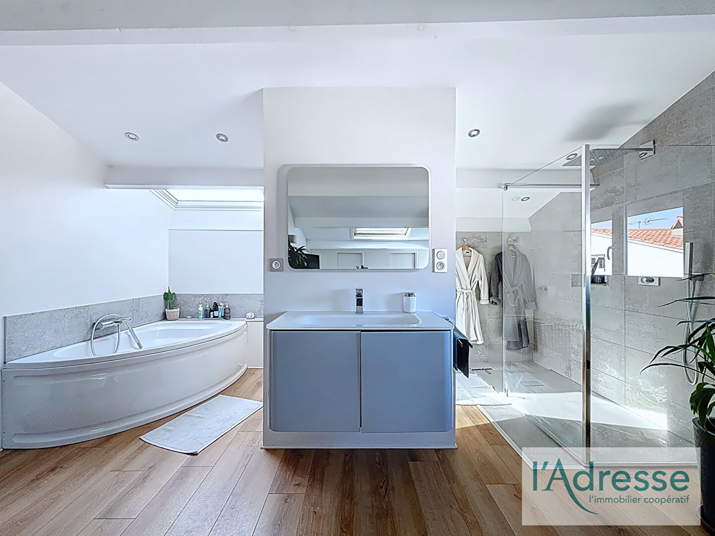 À l'étage, vous découvrirez une suite parentale de 30 m² avec baignoire et douche séparées par un mur, ainsi qu'une cinquième chambre de 11 m².