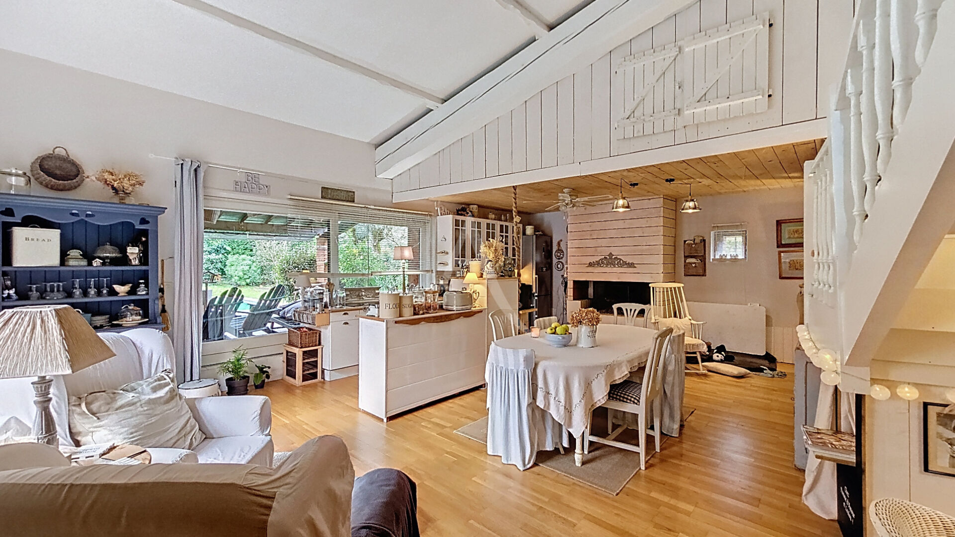 La pièce principale, orientée terrasse et piscine, est composée d'une vaste cuisine ouverte, espace repas et d'un premier salon. Le second salon de 28m2, intimiste, est équipé d'une vaste cheminée, idéal pour les soirées d'hiver.