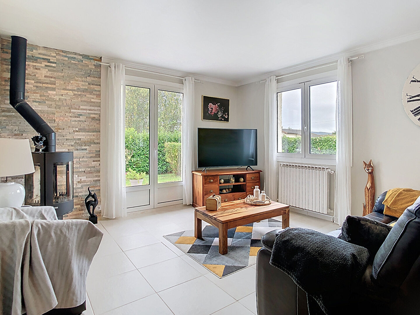 Entrée lumineuse desservant une agréable pièce de vie, salon avec poêle à bois, salle à manger, cuisine aménagée et équipée, accès à la terrasse.