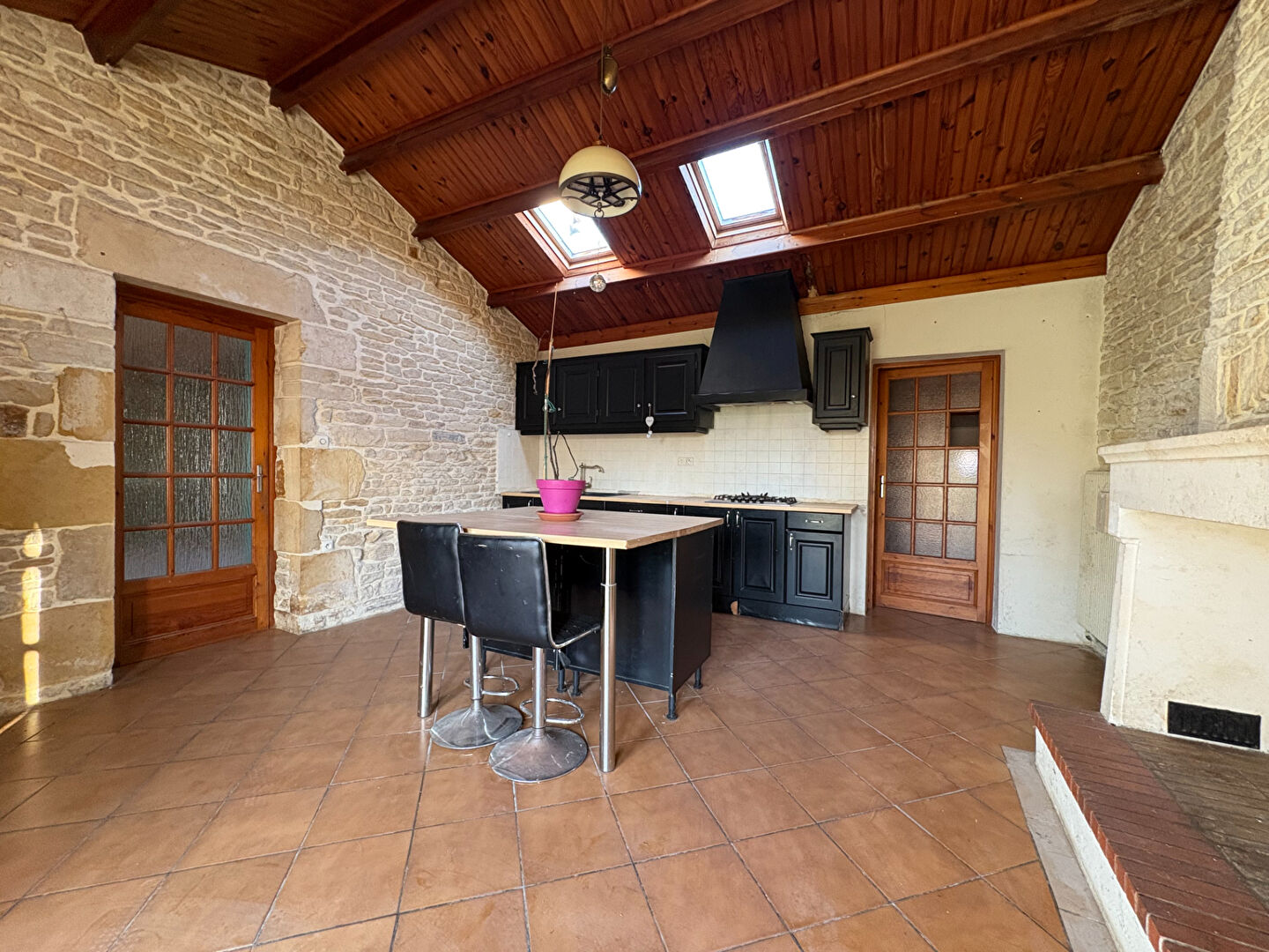 L'entrée s'ouvre sur une cuisine aménagée avec son magnifique foyer cheminée.
