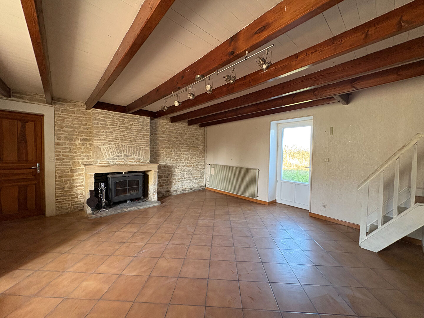 D'autre part, un salon/salle à manger bénéficiant d'un poêle à bois et d'une belle décoration grâce à son mur en pierre apparente.