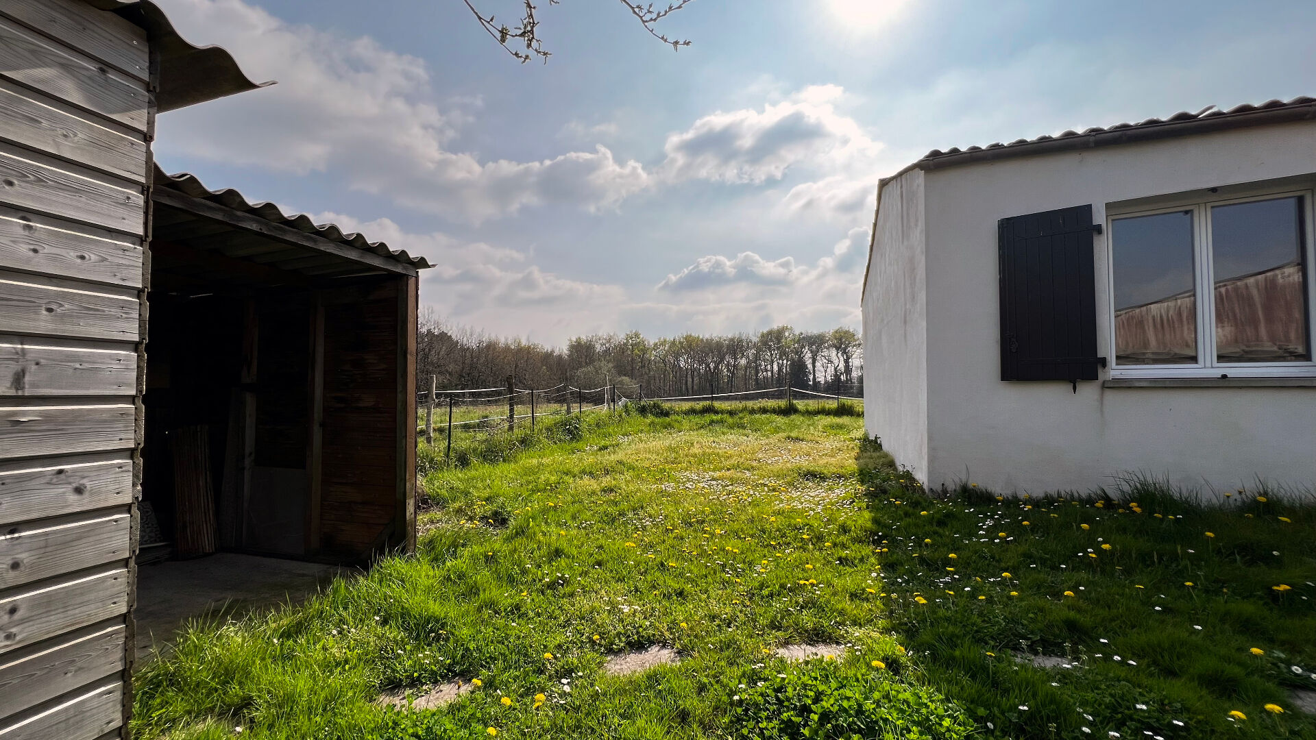 A l'extérieur, le jardin permet de faire le tour de la maison, un cabanon sur fondations béton complète le tout.