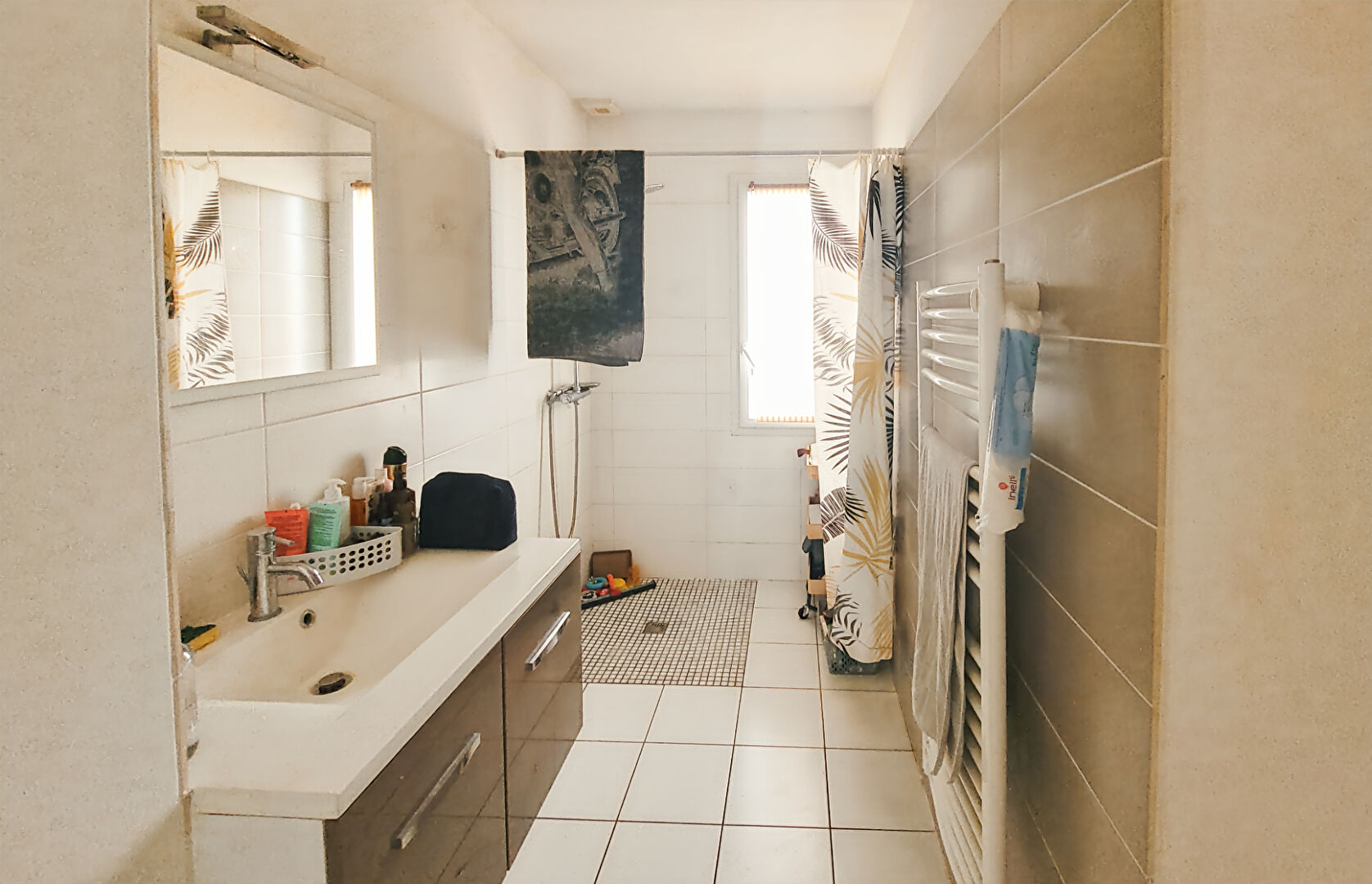 Elle se compose d'une entrée avec placard, d'une pièce de vie lumineuse de 44 m² avec cuisine aménagée, d'un dégagement, d'un w.c. suspendu, d'une salle d'eau avec douche à l'italienne et de trois chambres carrelées avec placard.