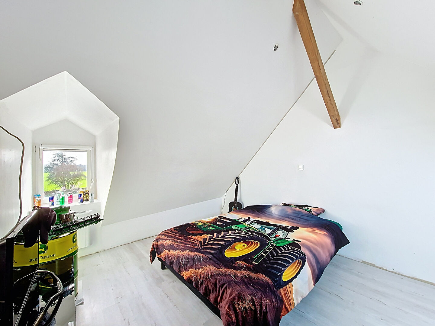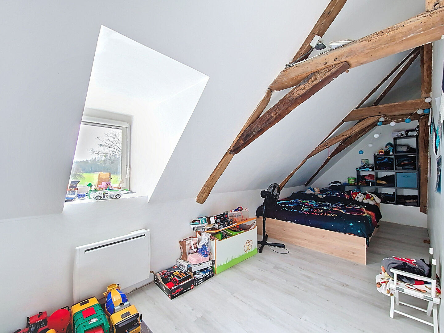 À l'étage, trois chambres mansardées avec parquet flottant offrent de beaux volumes complémentaires pour toute la famille.