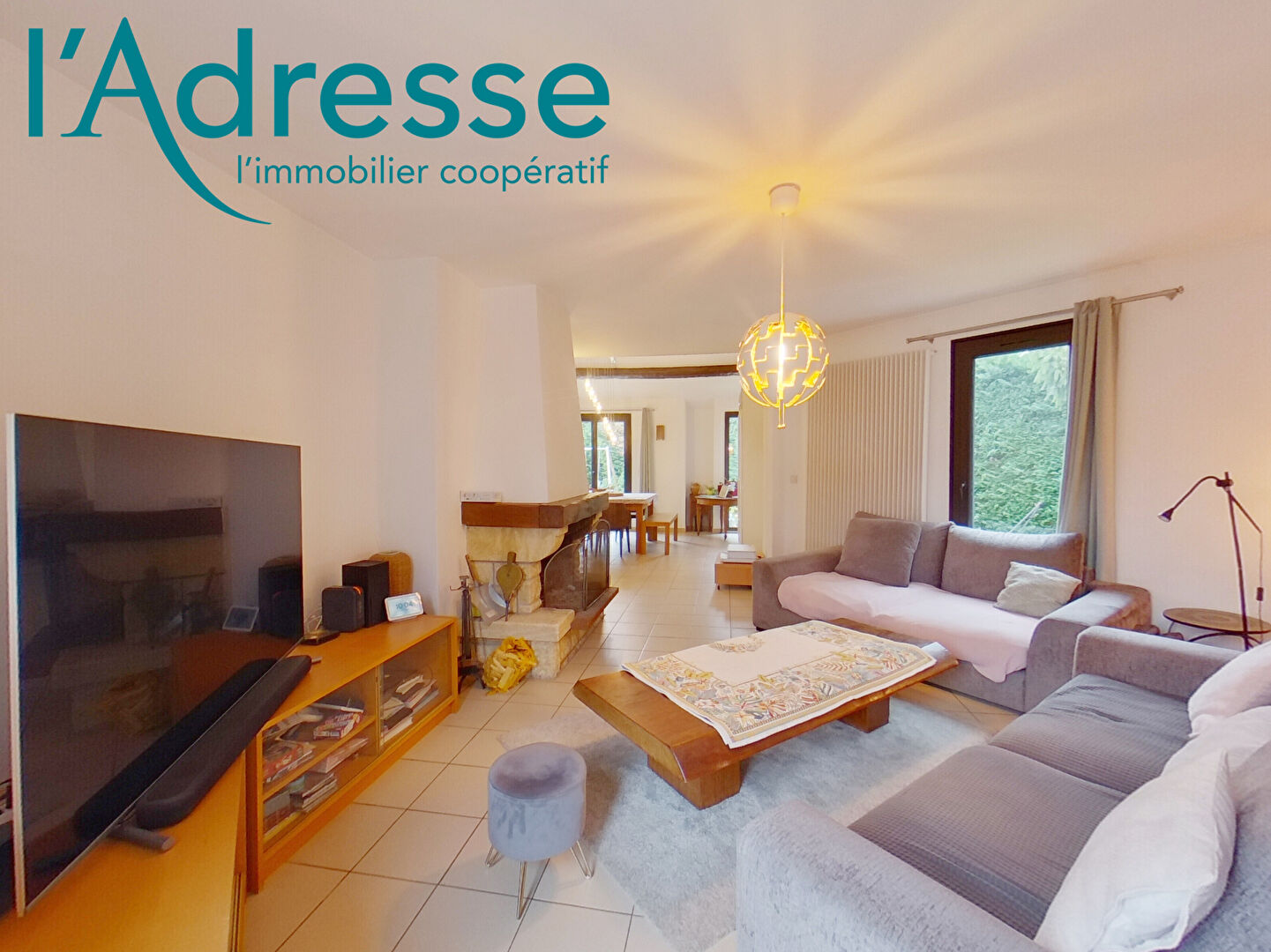 - Un séjour cathédrale lumineux avec cheminée, donnant sur une terrasse et un jardin arboré, idéal pour vos moments de détente