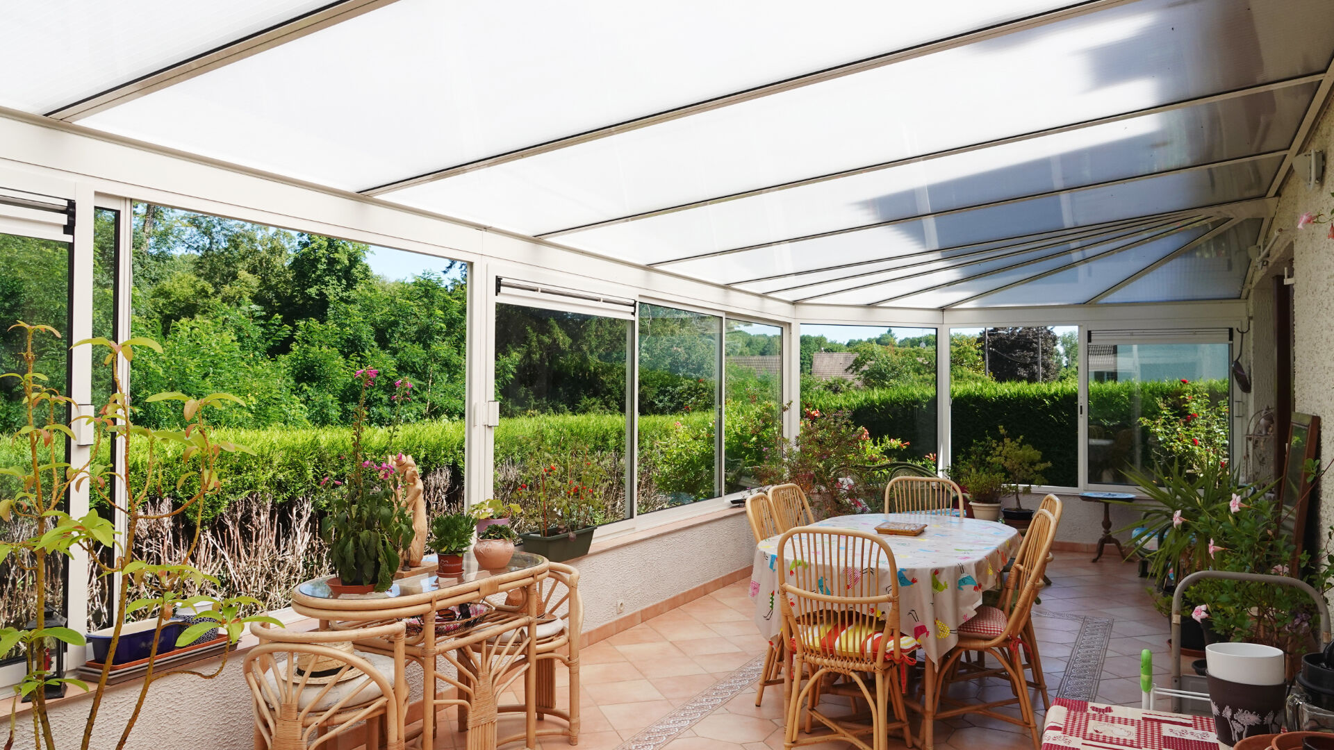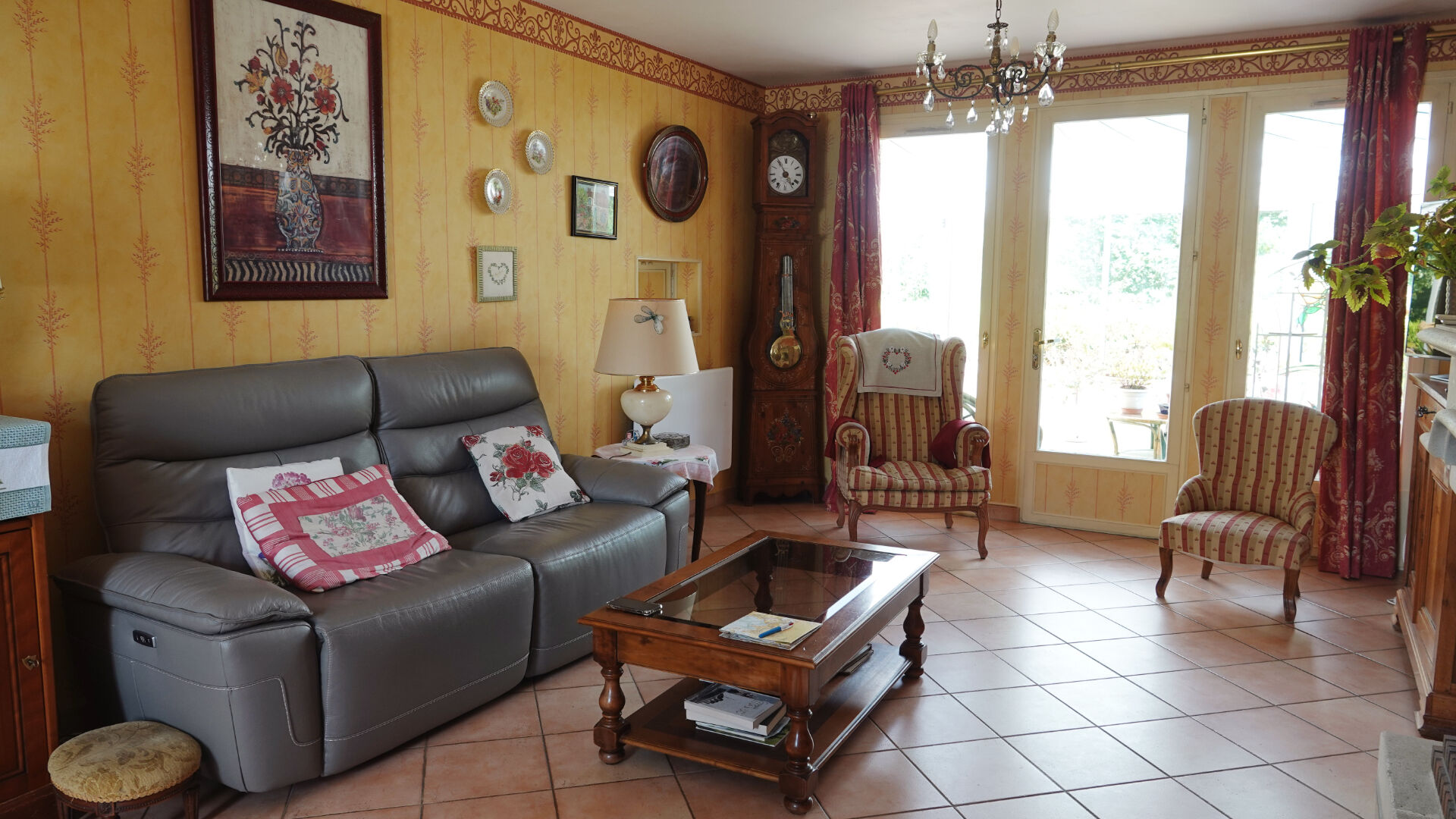 Grand salon-séjour lumineux, agrémenté d'une cheminée, s'ouvrant sur une véranda de 36 m²