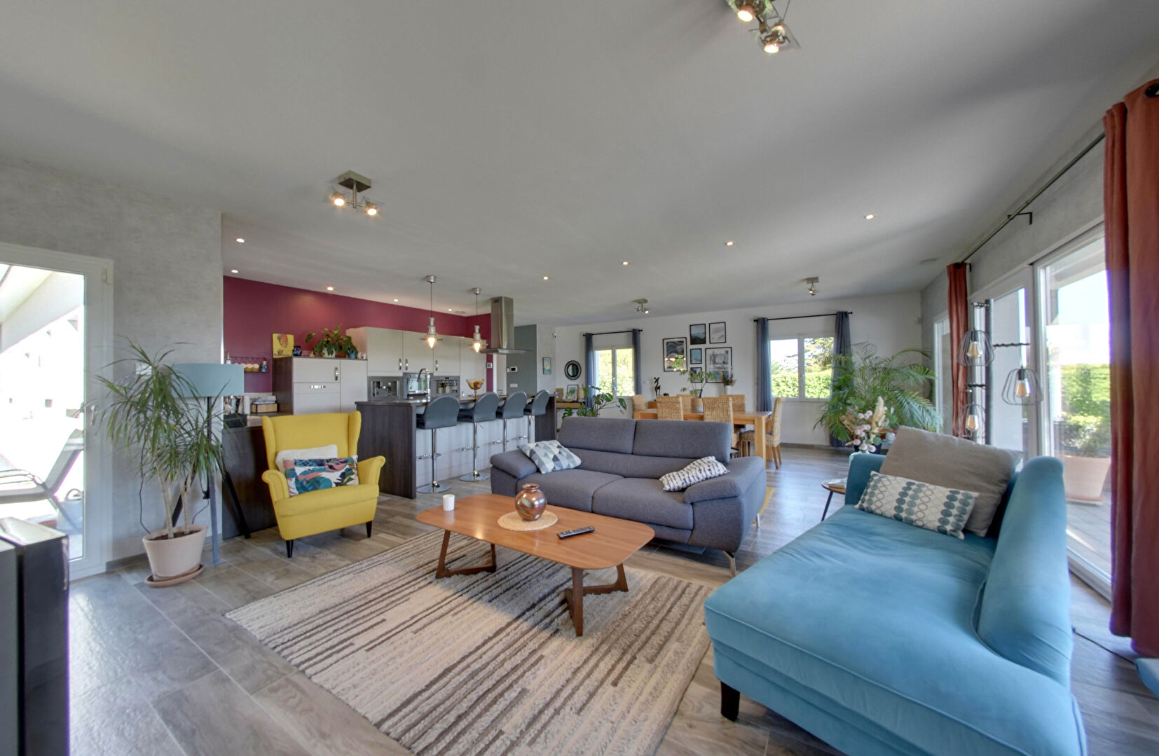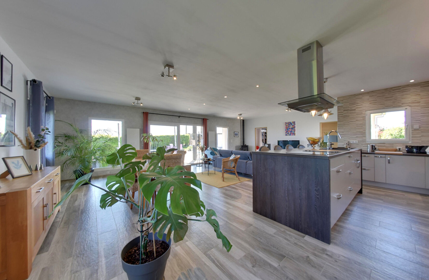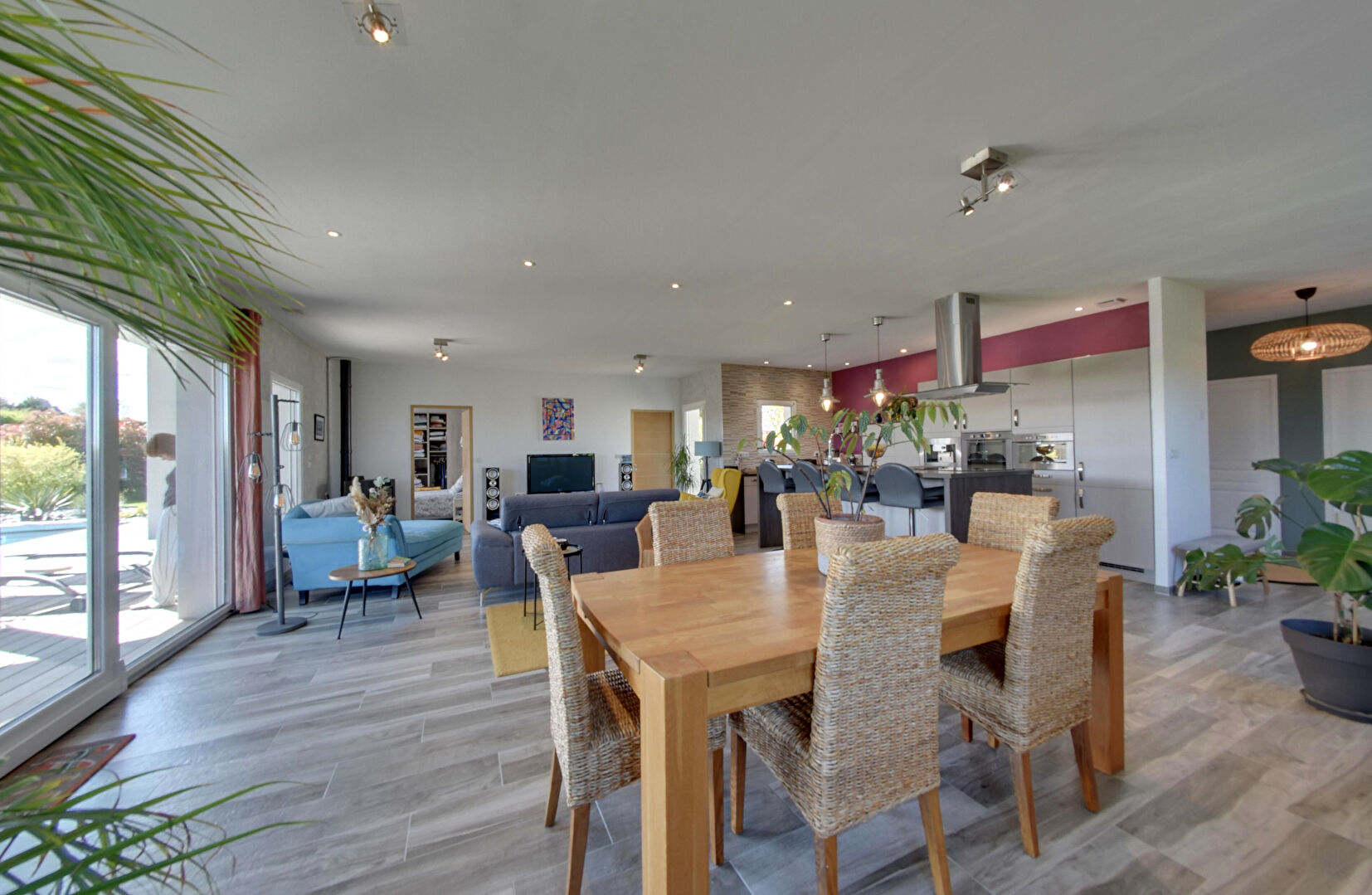 Vous découvrirez une magnifique pièce de vie de 55 m², lumineuse et chaleureuse, avec