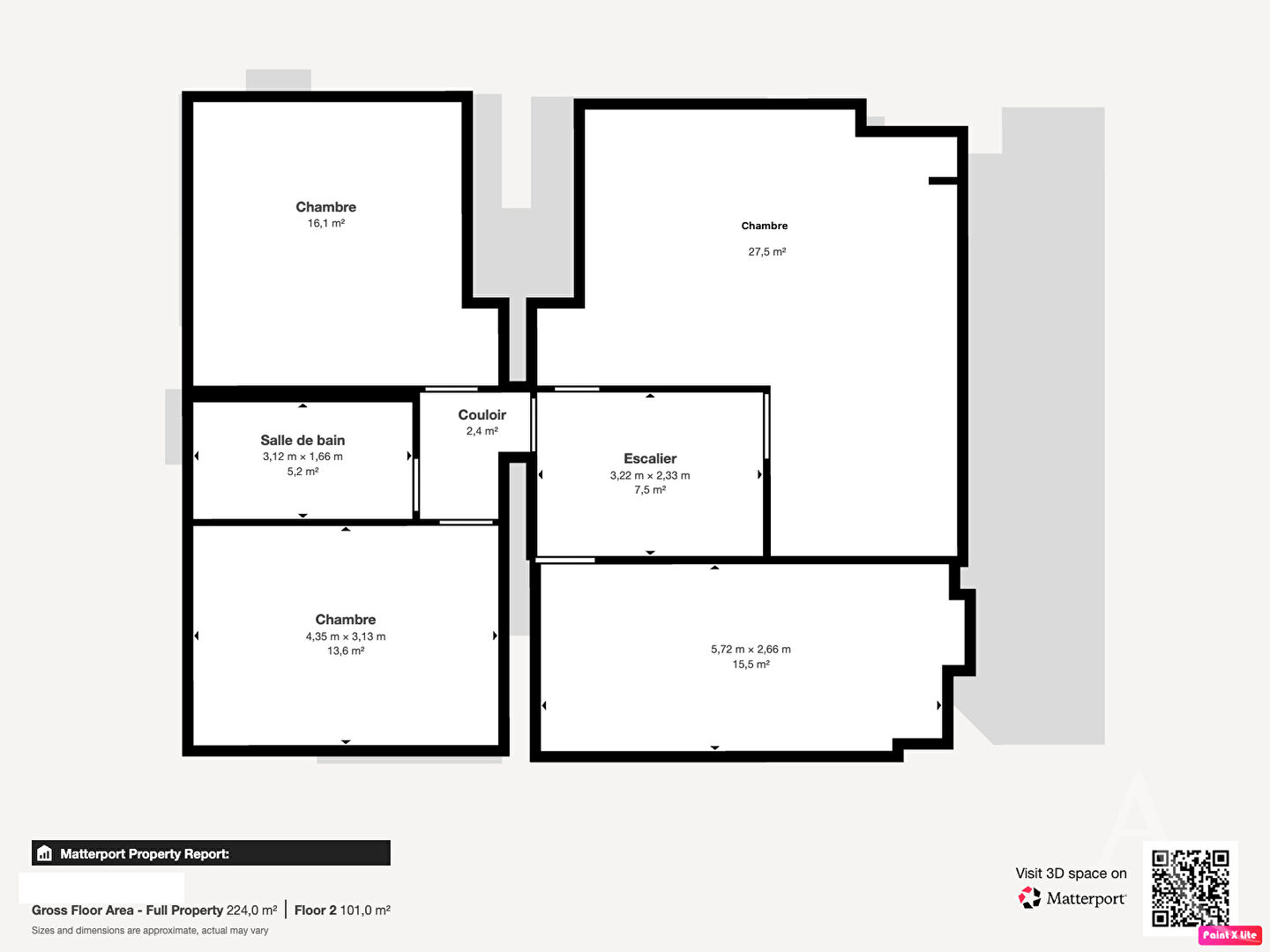 A l'étage : Quatre grandes chambres, dont une avec salle de bains, et une proposant un point d'eau et une mezzanine. Salle d'eau avec W.C et grenier.