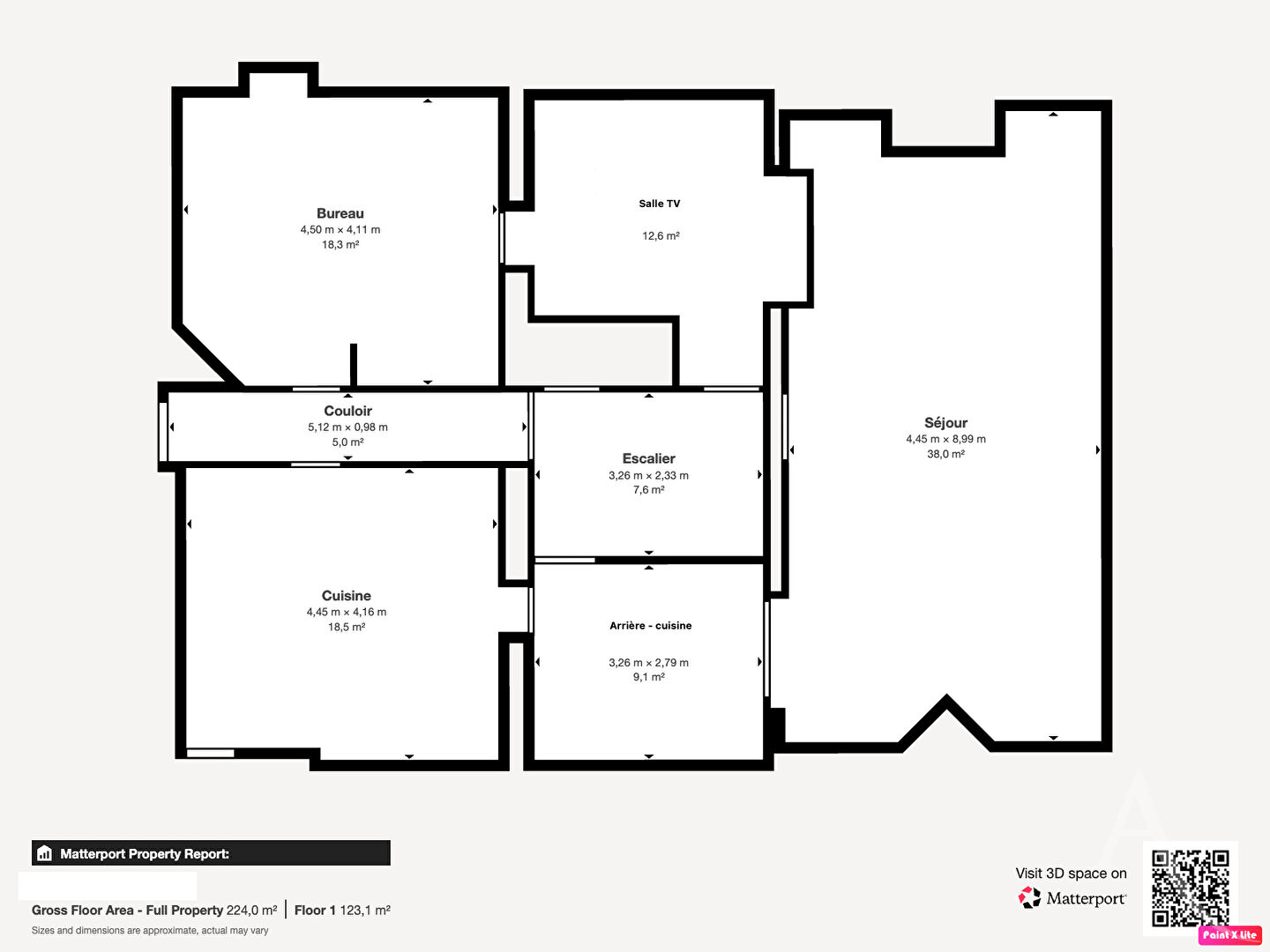 Au rez-de-chaussée : entrée, cuisine, arrière-cuisine, salle d'eau avec W.C, salle à manger/séjour de 38m2, bureau et salle TV.