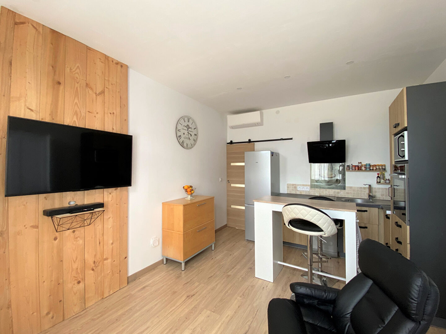 L'entrée se fait par une cuisine aménagée et équipée neuve.