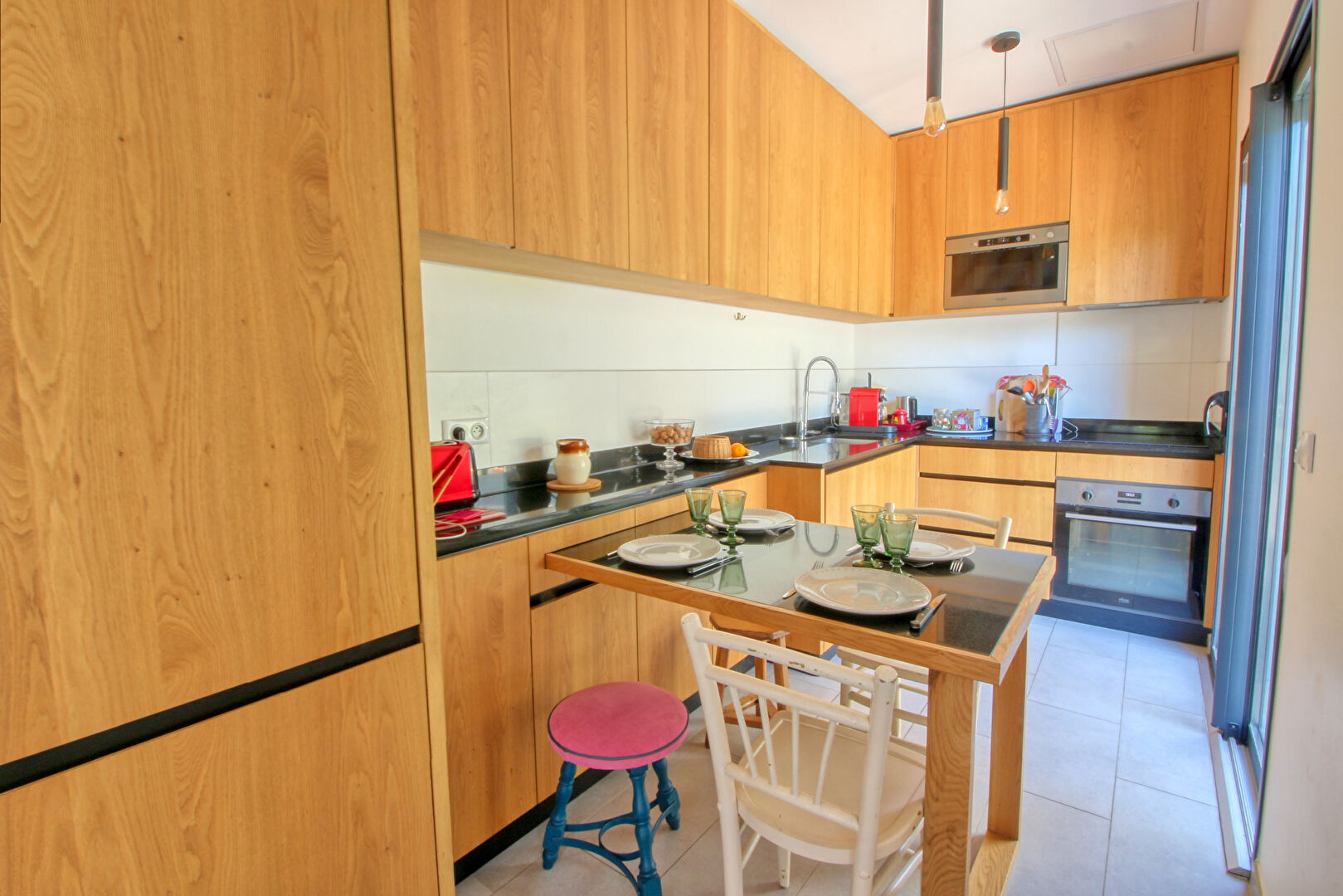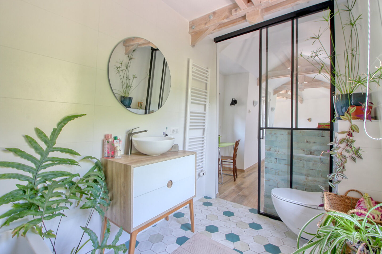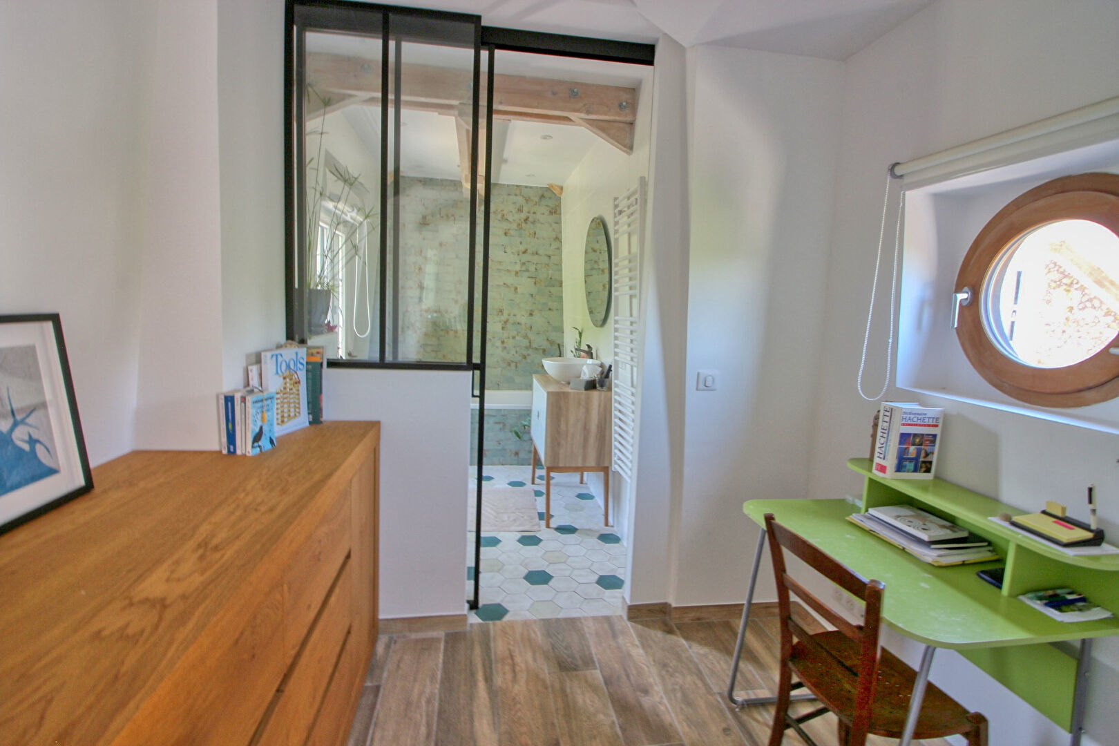 Portail automatique, chauffage au sol basse température, placards sur mesure chêne dans toutes les pièces, fenêtres aluminium oscillo-battantes, volets roulants électriques.