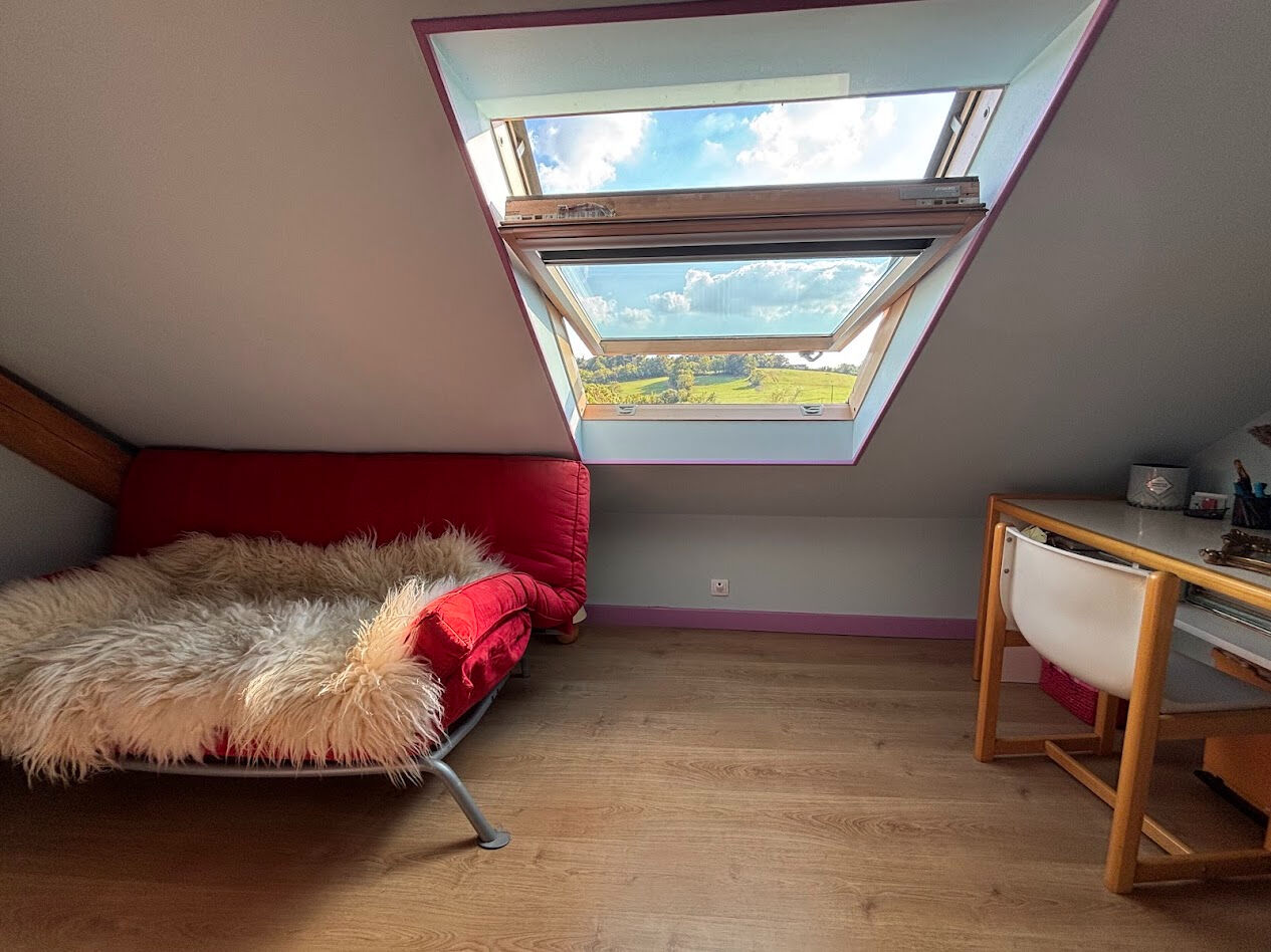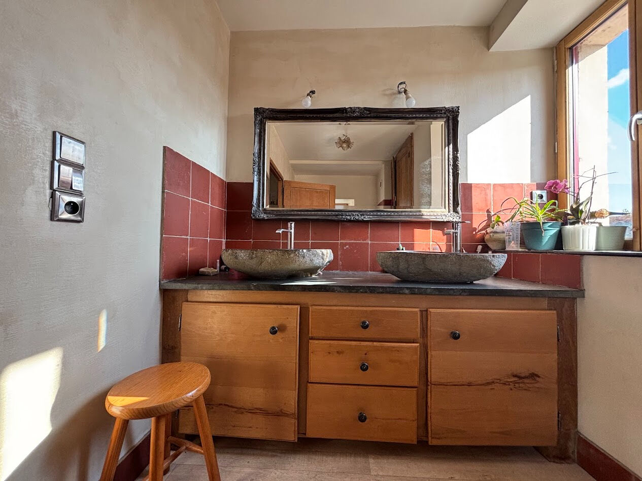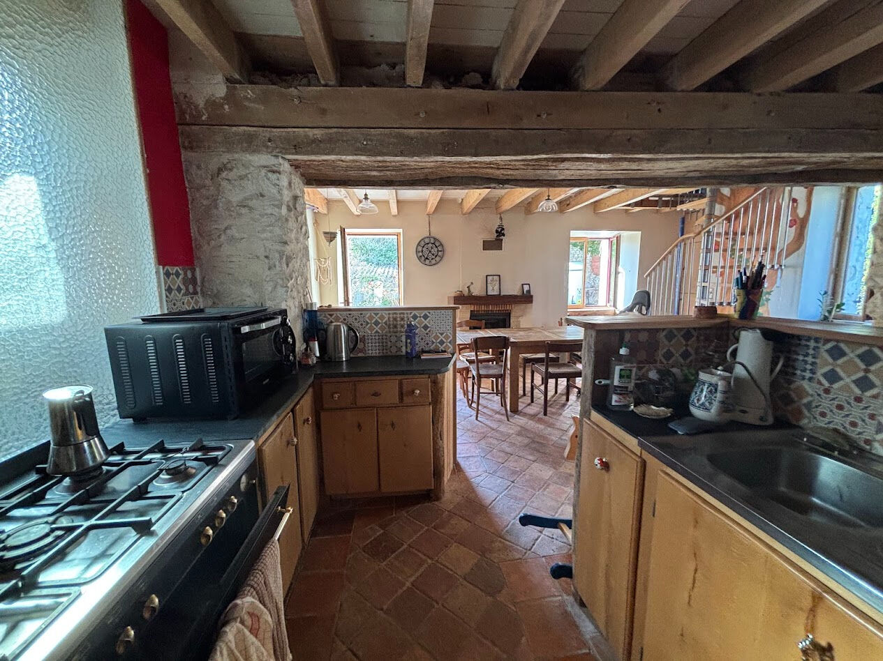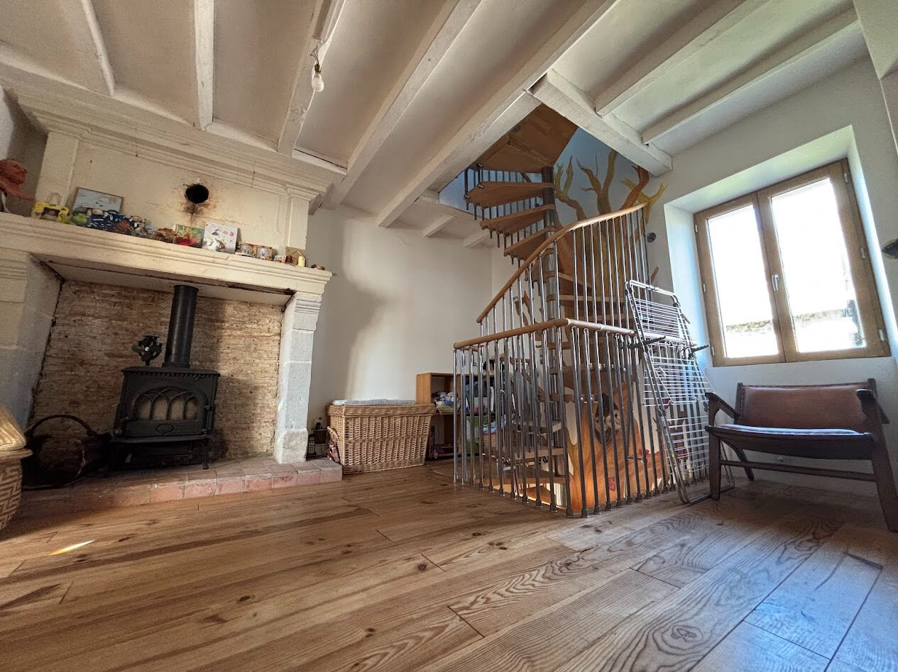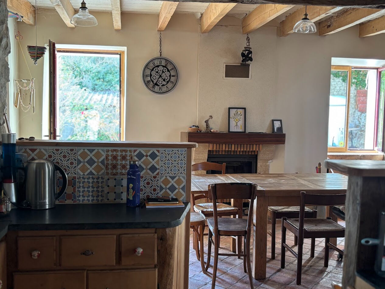 Située dans un environnement calme et verdoyant, cette maison séduit par son authenticité avec ses tomettes anciennes, ses poutres apparentes et son poêle à bois qui apporte chaleur et convivialité.
