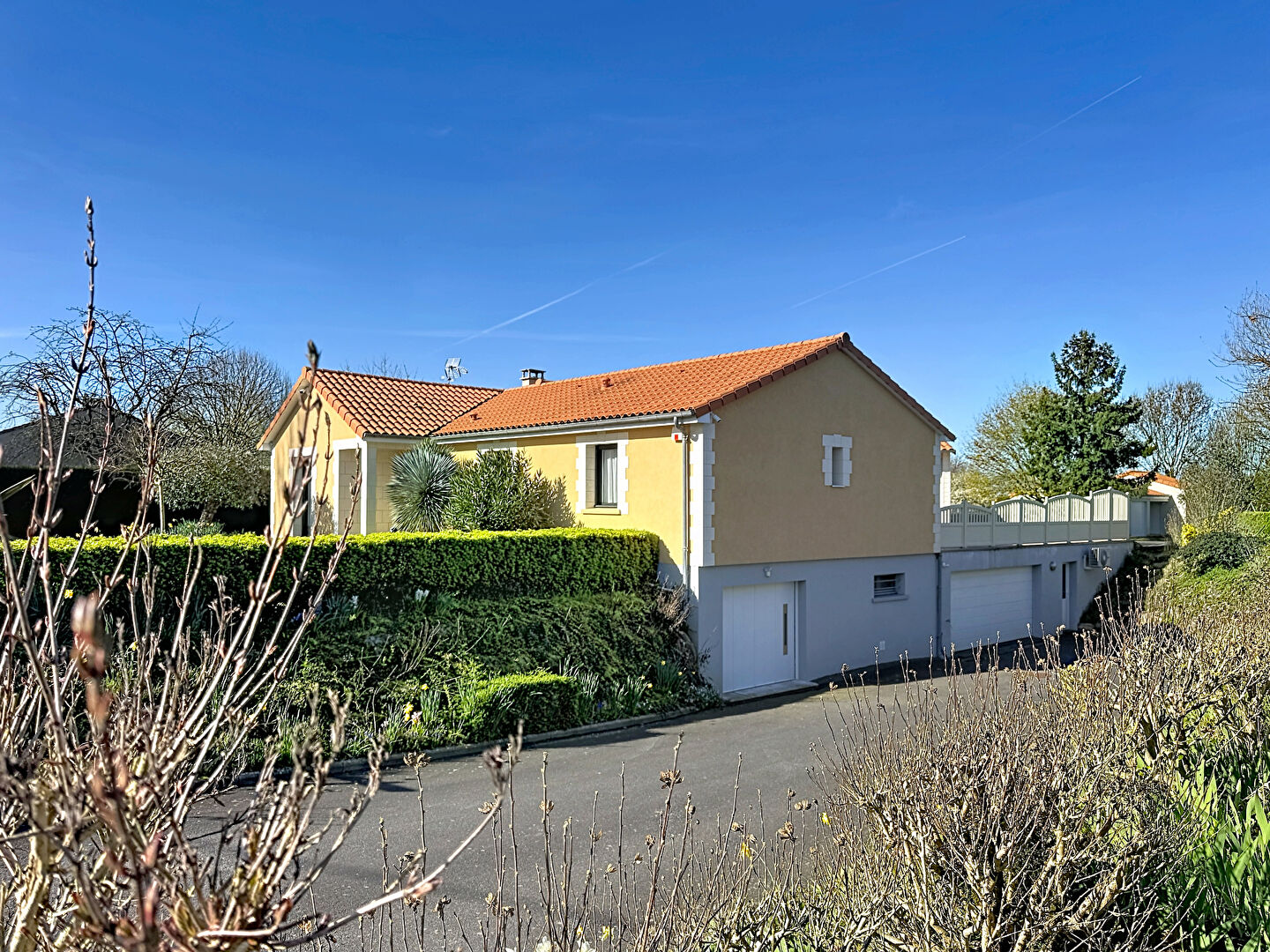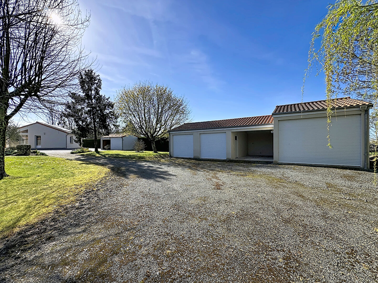Édifiée sur une parcelle constructible de plus de 3 500 m², soigneusement arborée et paysagée, la propriété dispose également de deux garages fermés supplémentaires.