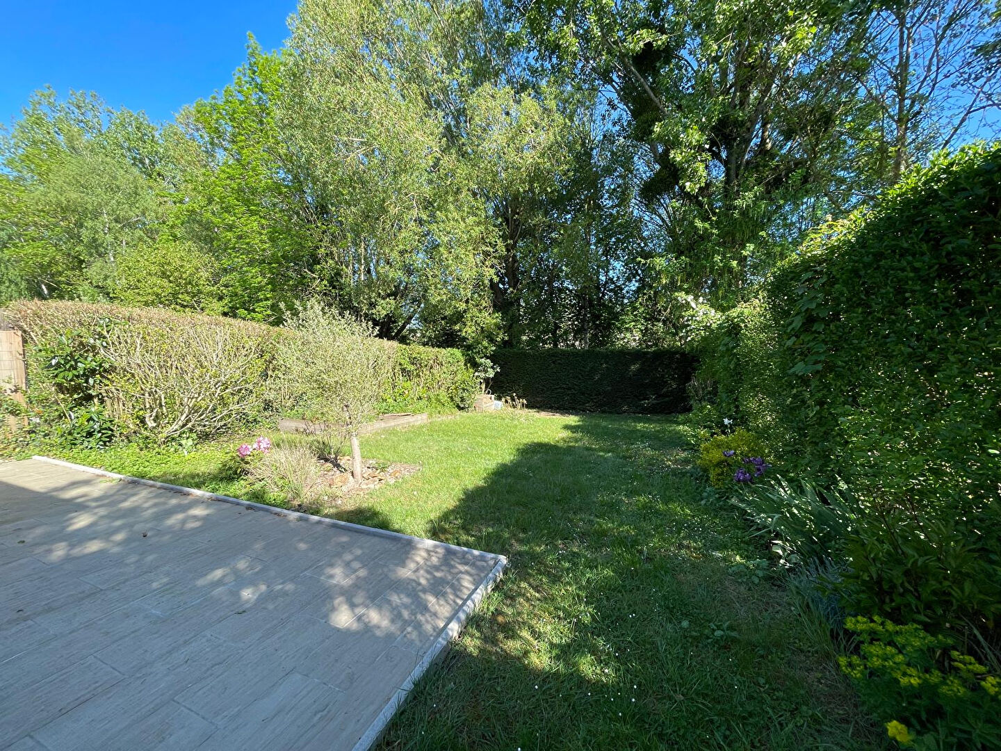 À l'extérieur, le terrain sans vis à vis propose une belle terrasse entièrement refaite, et une vue privilégiée sur un cadre de verdure !