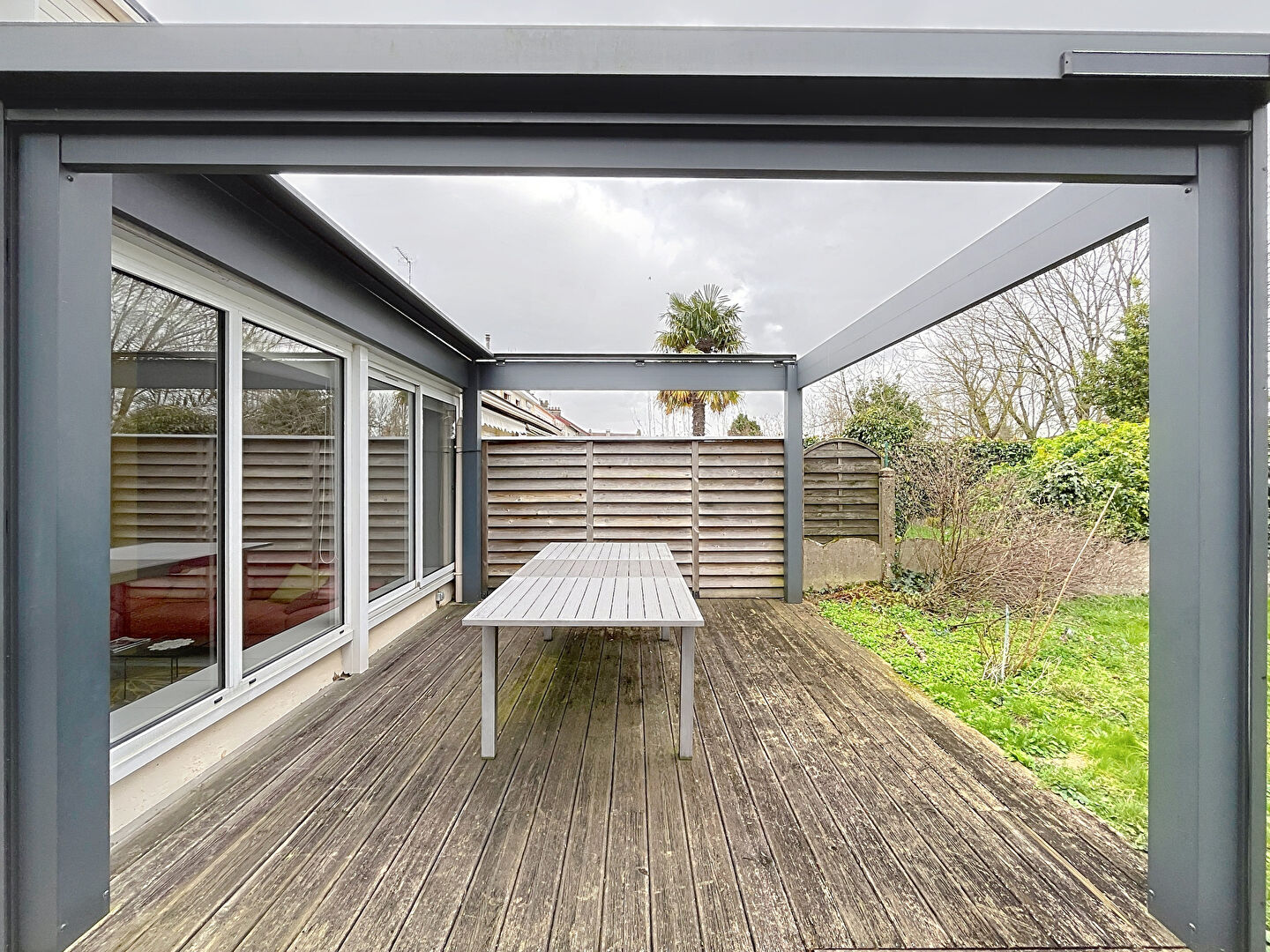À l'extérieur, vous profiterez d'une terrasse avec pergola idéale pour profiter des beaux jours, d'un jardin agréable, d'un cabanon pour le rangement et d'un garage.