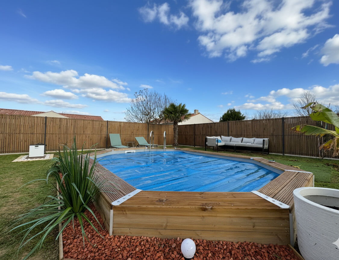 À l'extérieur, vous serez charmé par le jardin entièrement clos et arboré. C'est un véritable havre de paix où vous pourrez profiter des arbres fruitiers et vous détendre au bord de la piscine semi-enterrée.