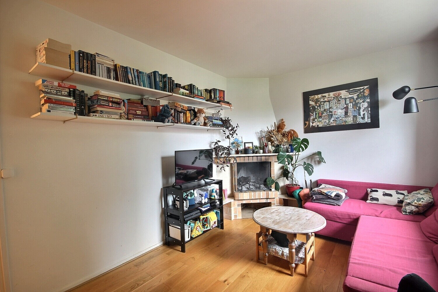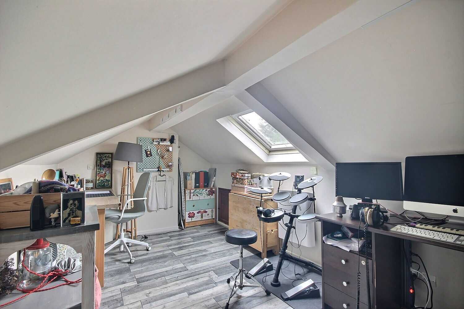 Au premier étage, deux chambres (actuellement l'une est un salon), et un accès aux combles aménagés en vaste espace bureau.