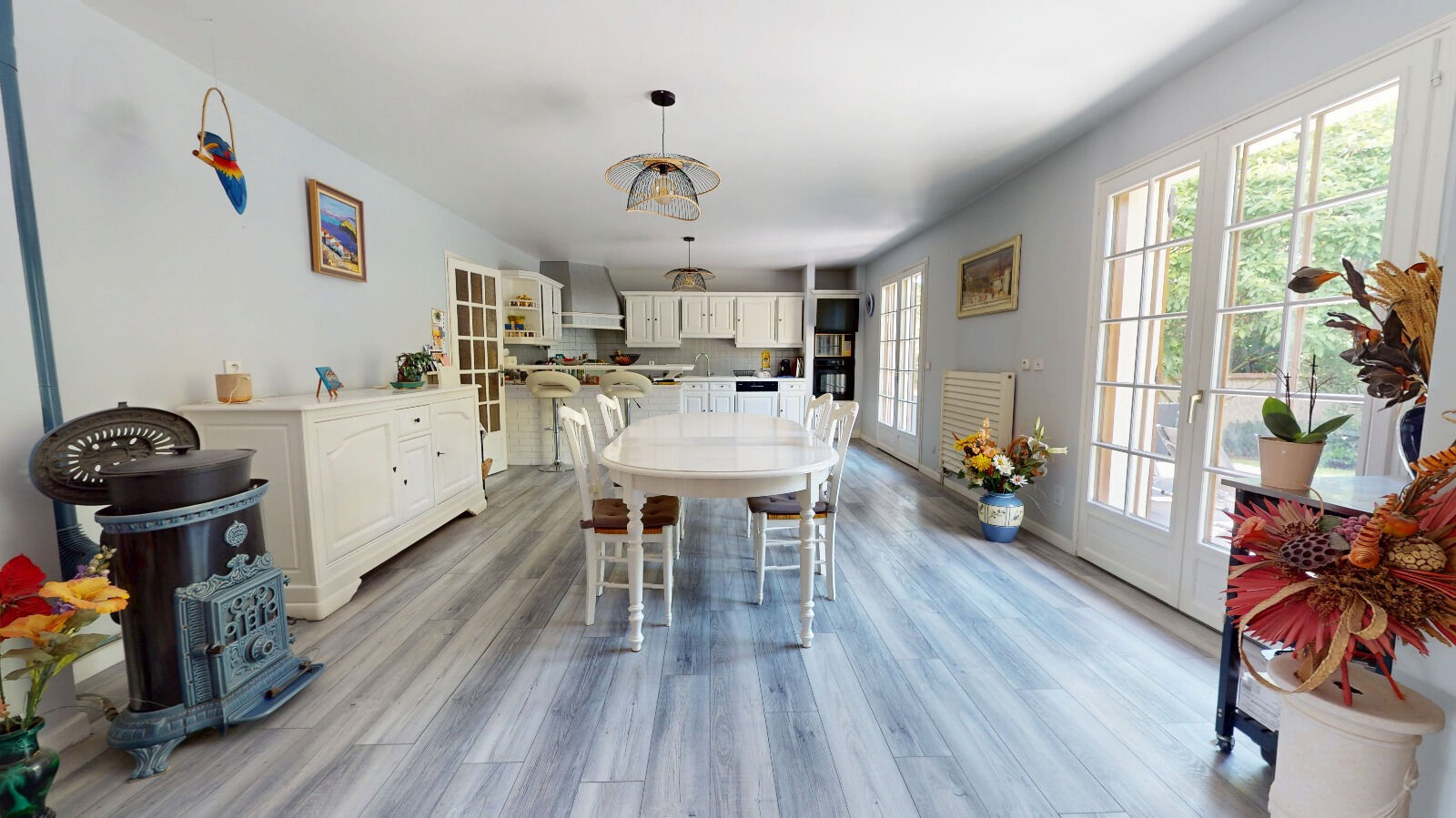 Au coeur de la maison, une cuisine dînatoire spacieuse devient le théâtre des repas partagés, alliant convivialité et fonctionnalité.