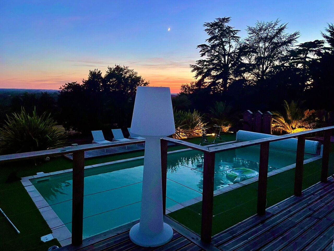 En extérieur : Piscine avec pompe a chaleur, volet roulant et terrasse tout autour de la maison.