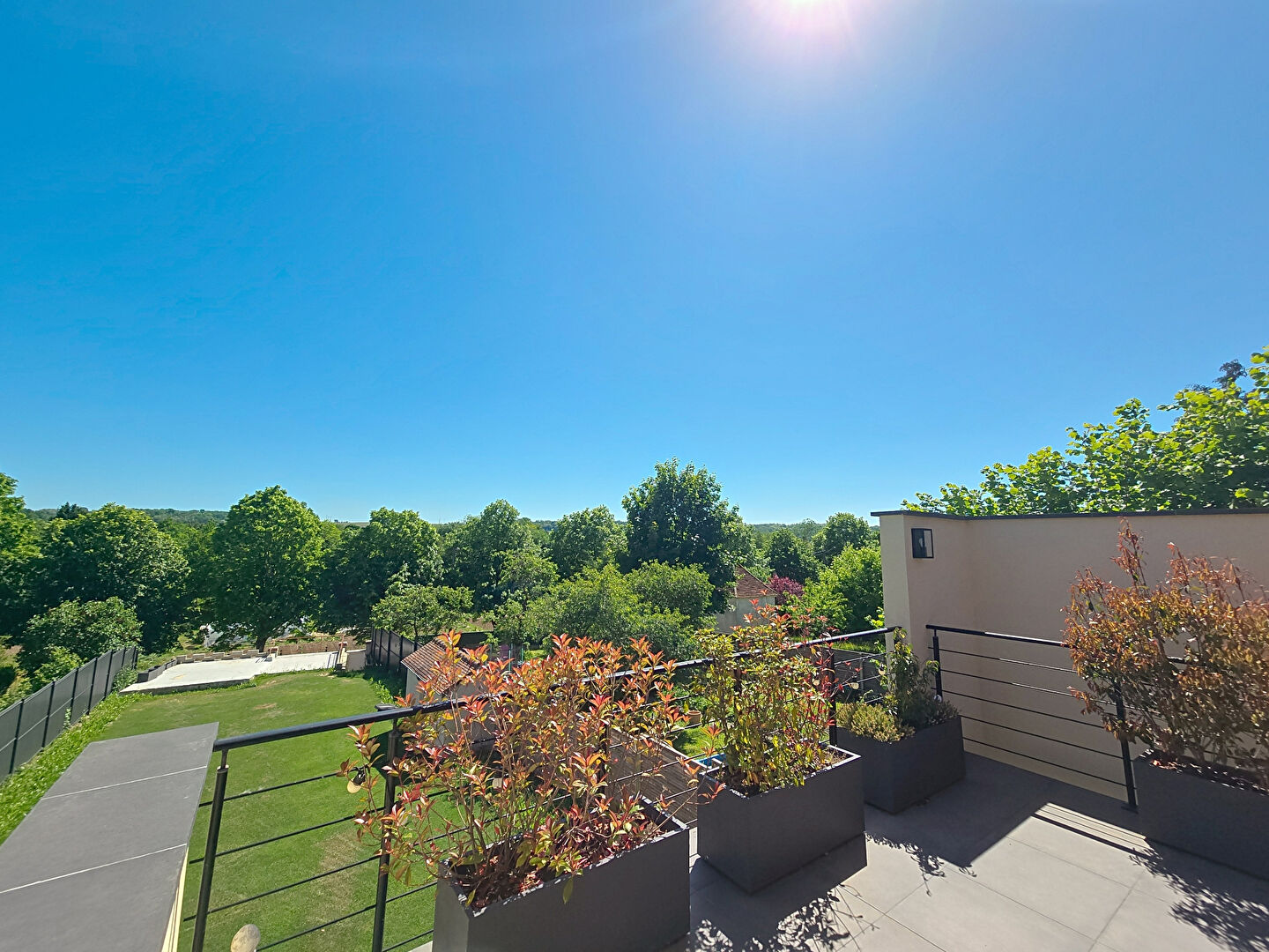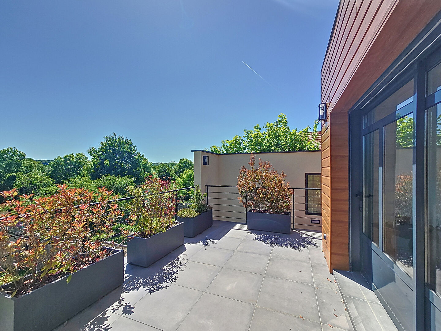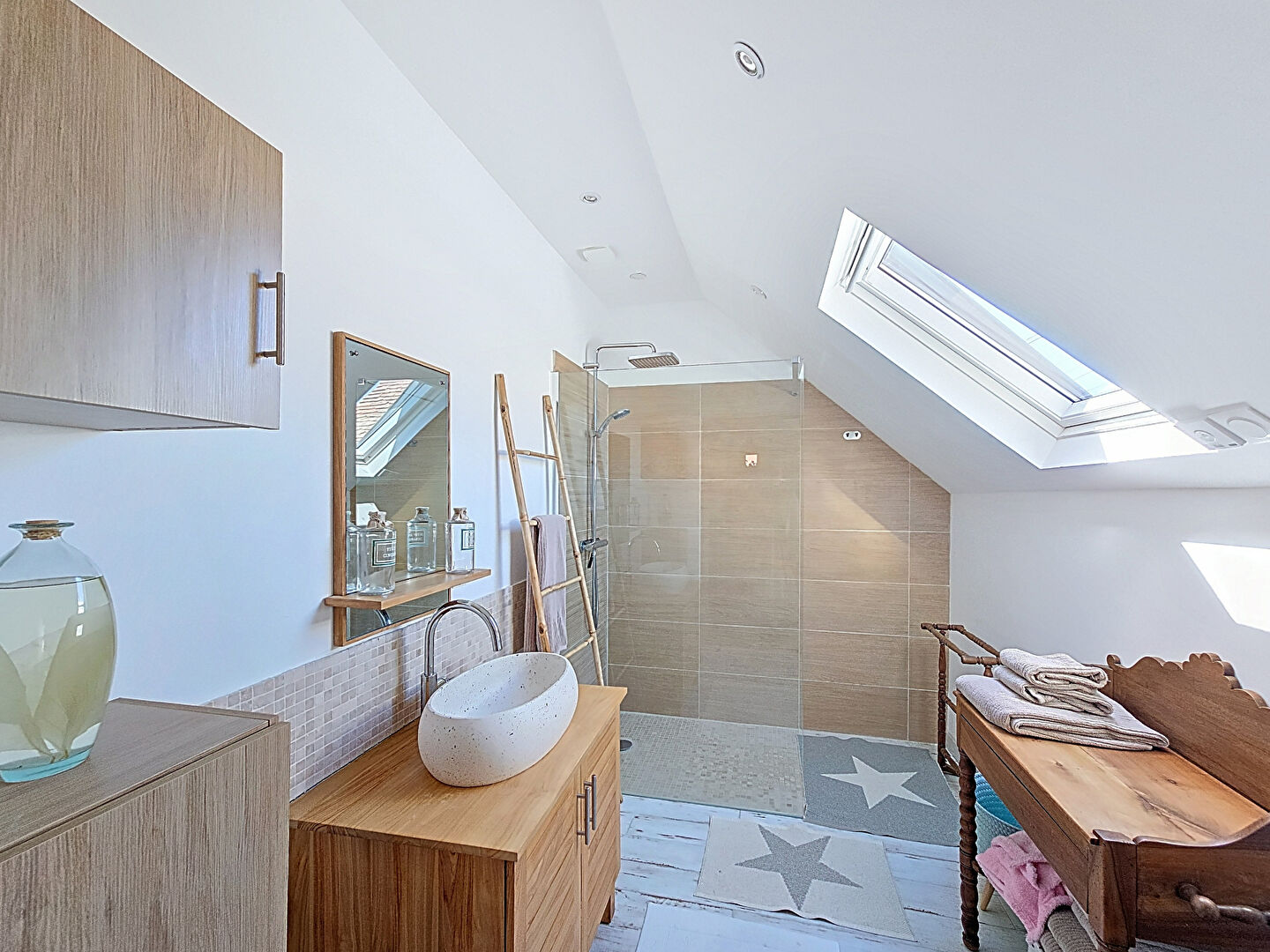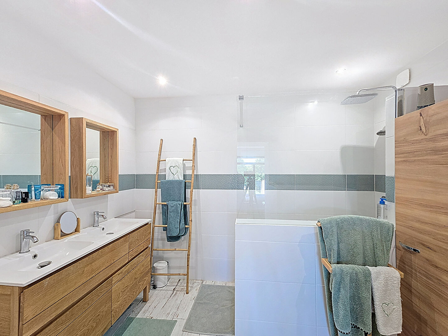 À l'étage, deux belles chambres lumineuses se partagent une vaste salle d'eau contemporaine, avec douche à l'italienne et toilettes séparées. En rez-de-jardin, un espace indépendant accueille une chambre avec salle d'eau privative, un bureau (ou chambre d'appoint), une buanderie, un dressing et le local technique. Ces pièces bénéficient elles aussi d'un accès direct à une seconde terrasse abritée, de plain-pied avec le jardin.