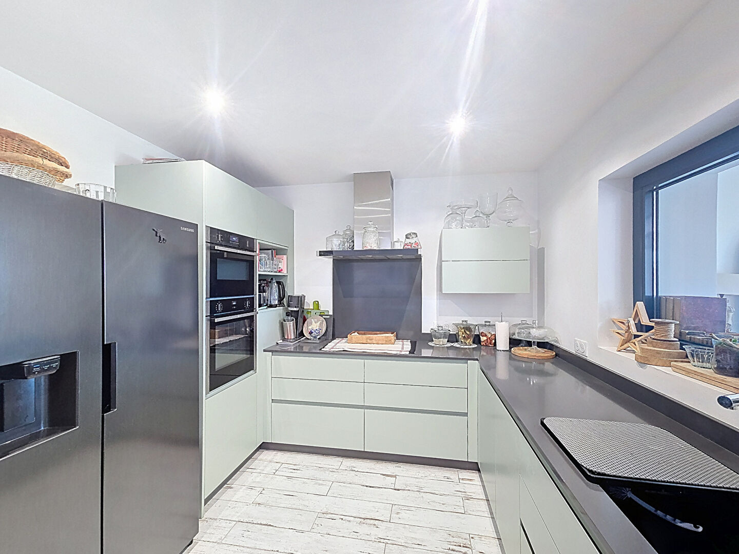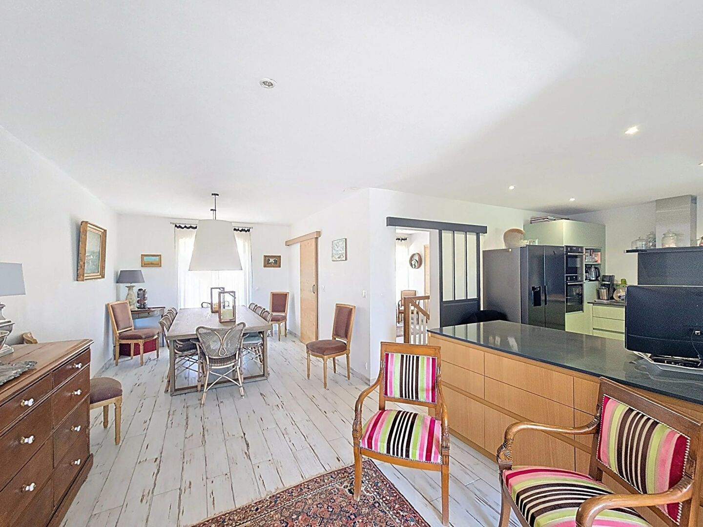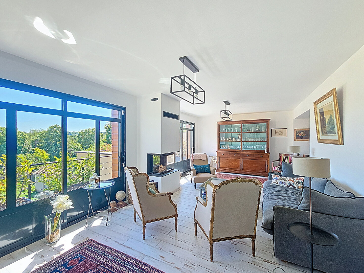 L'entrée, discrètement nichée derrière une cour, mène à un palier qui dévoile un vaste espace de vie baigné de lumière. La cuisine, partiellement ouverte et parfaitement équipée, communique avec une salle à manger conviviale prolongée par un salon chaleureux avec cheminée à insert. De grandes baies vitrées permettent de profiter pleinement de la terrasse principale et de la vue.