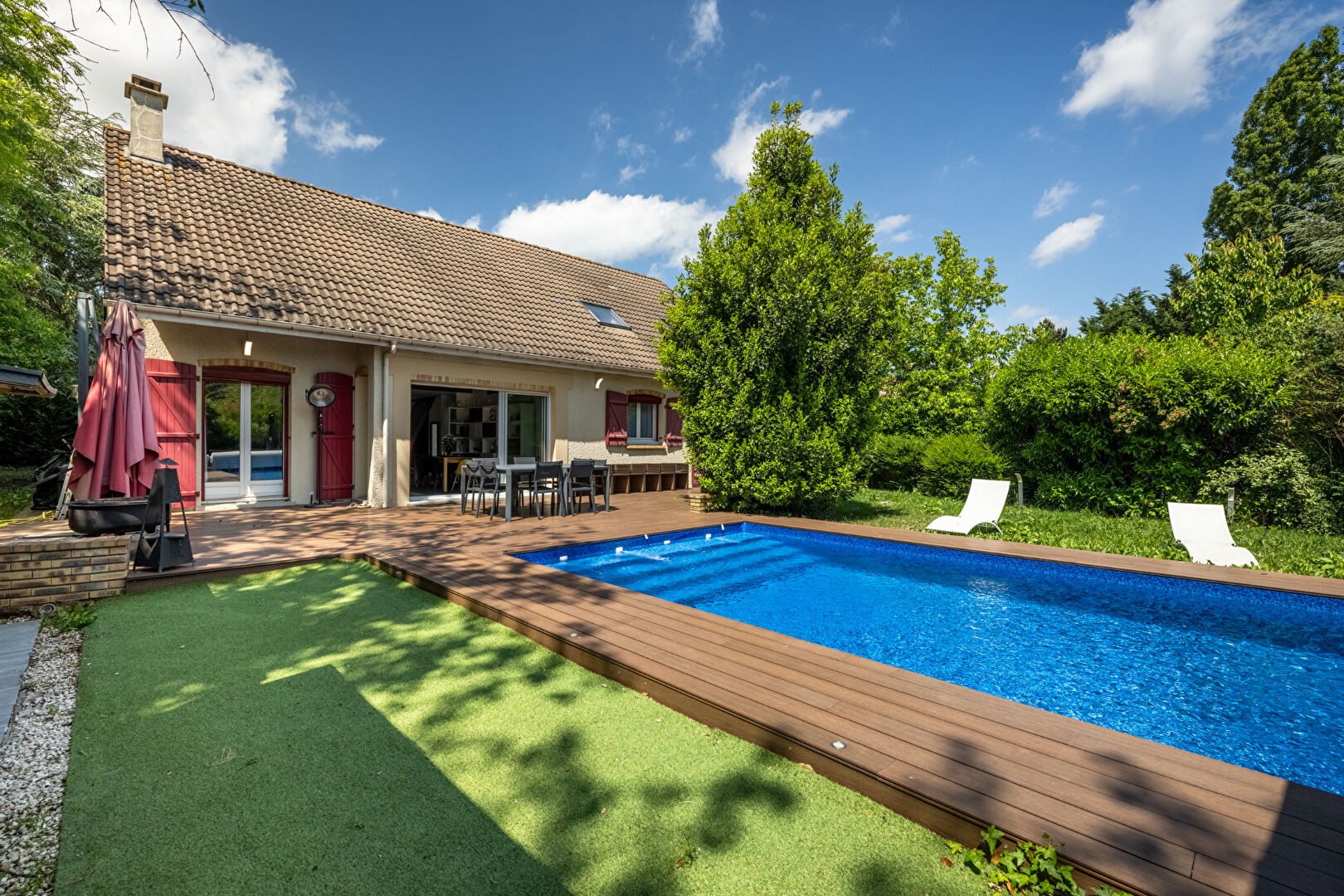 L'extérieur dispose d'un terrain de 1000 mètres carrés sans aucun vis-à-vis. Il comprend une piscine, une cuisine d'été et un garage double. Les fenêtres sont récentes et la maison offre des prestations de qualité.