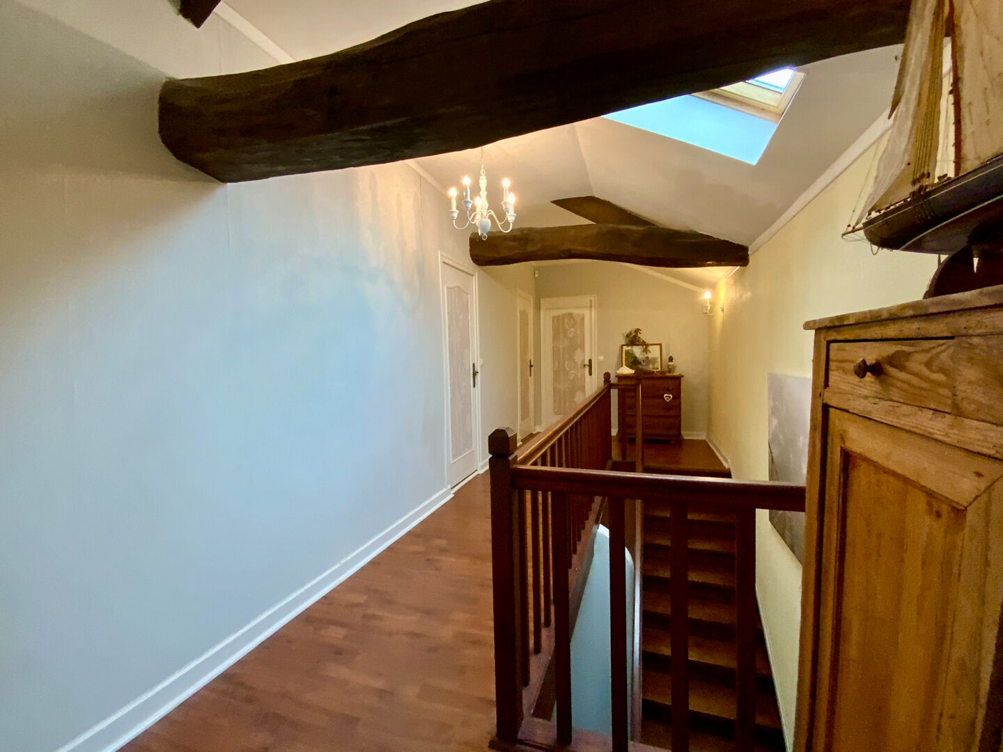 À l'étage, l'espace nuit se compose de deux chambres supplémentaires ainsi que d'un bureau, une salle bain et un wc.