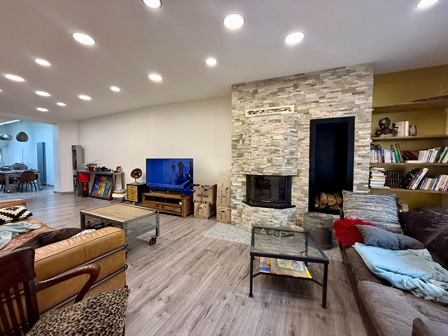 Édifiée sur trois niveaux, la maison séduit dès l'entrée par son grand espace de vie, composé d'un salon, d'une salle à manger et d'une cuisine ouverte aménagée et équipée, offrant un cadre convivial et fonctionnel. Une belle cheminée vient compléter l'ensemble et apporte une atmosphère chaleureuse.