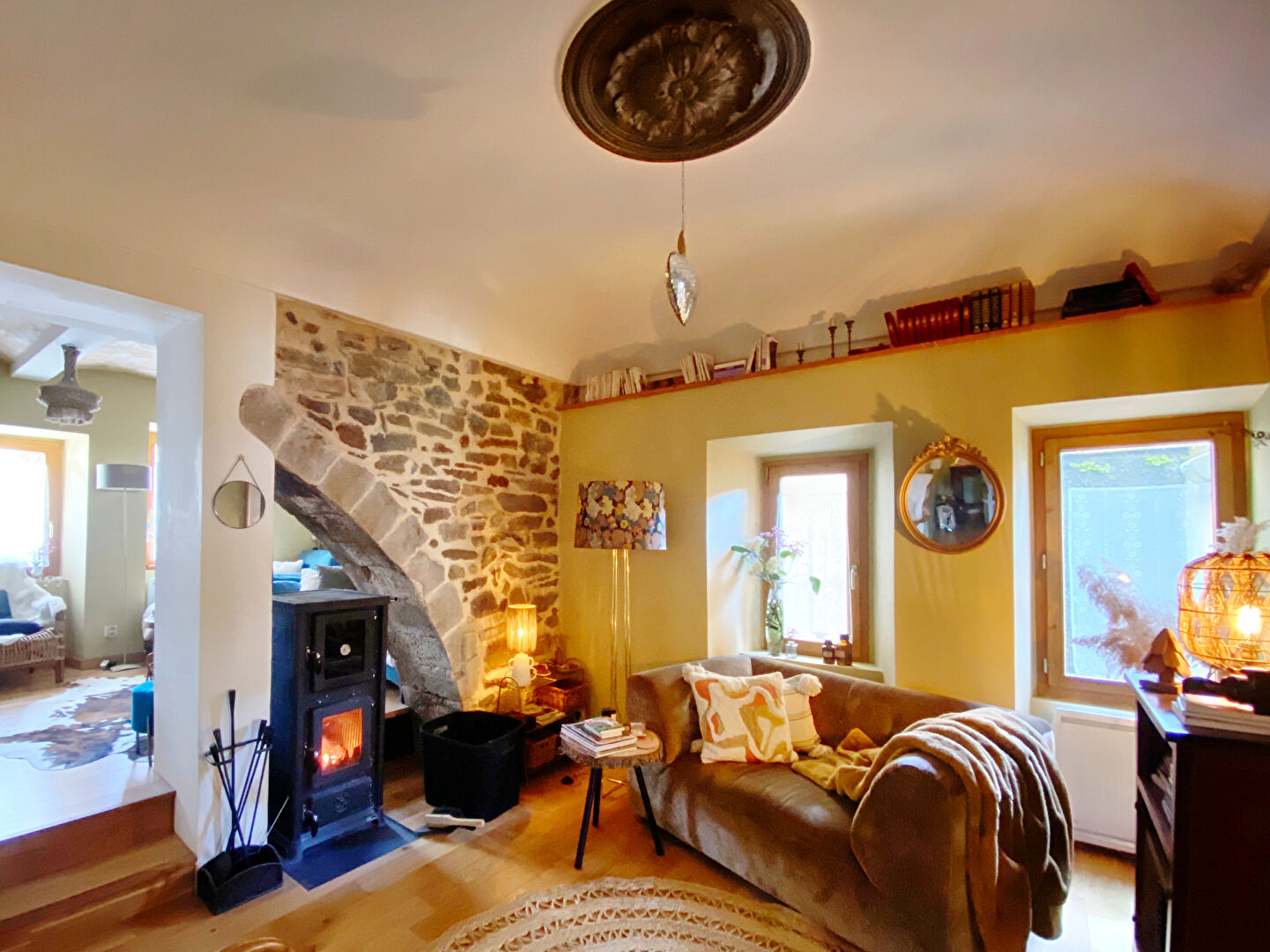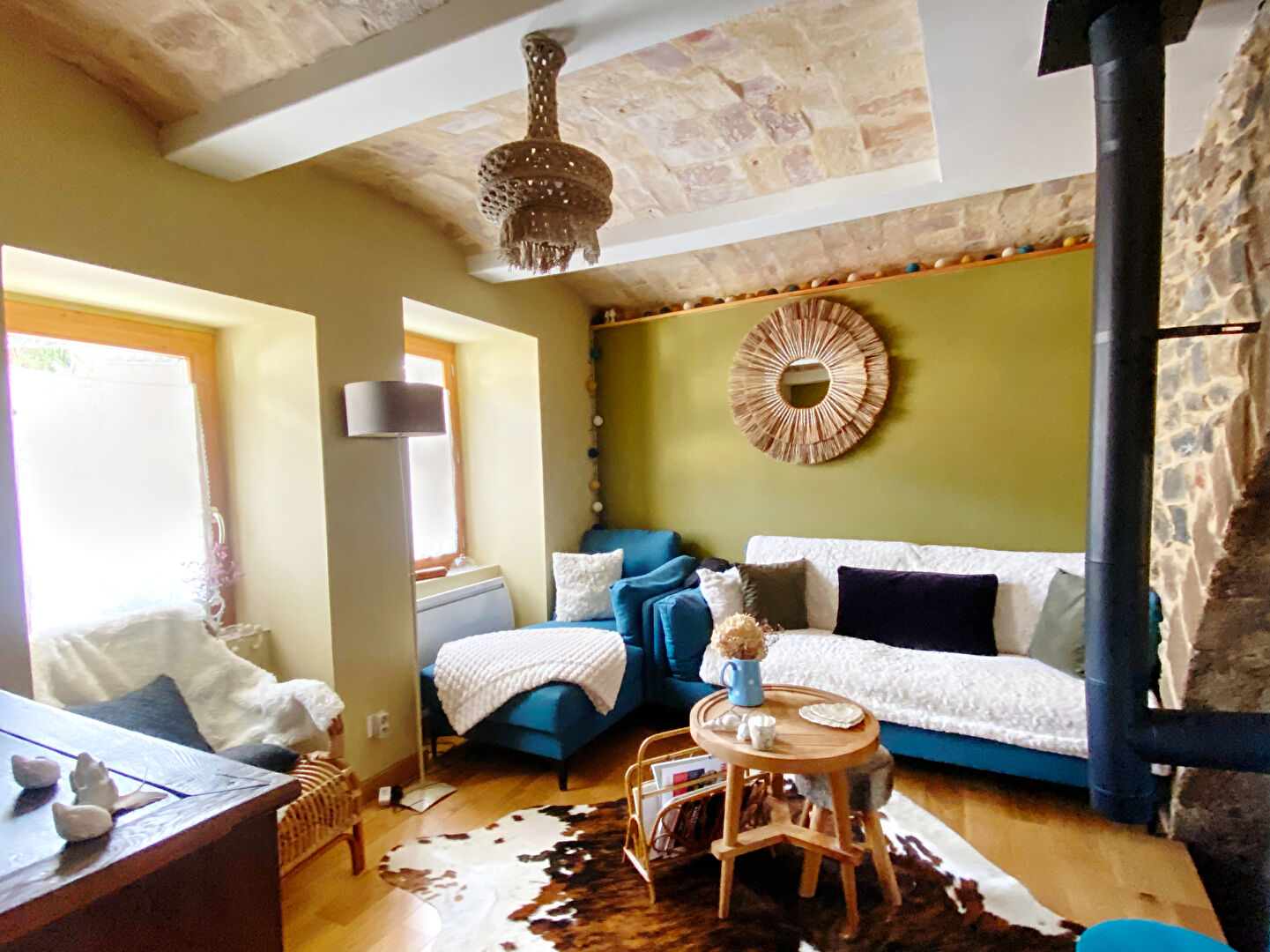 Pièce à vivre chaleureuse, agrémentée d'un poêle à bois pour des soirées douillettes.