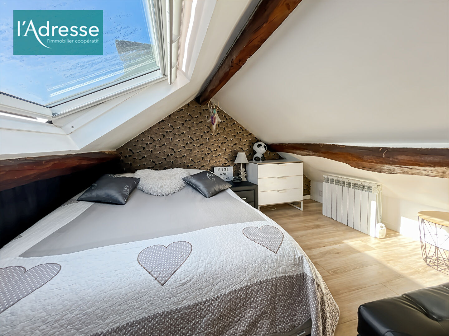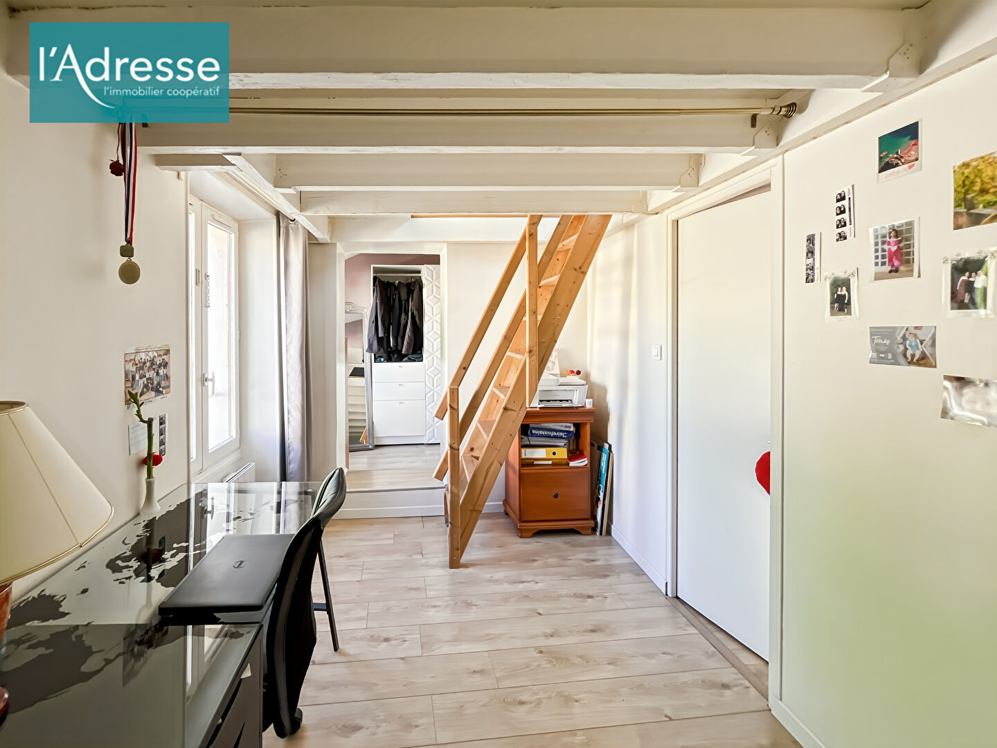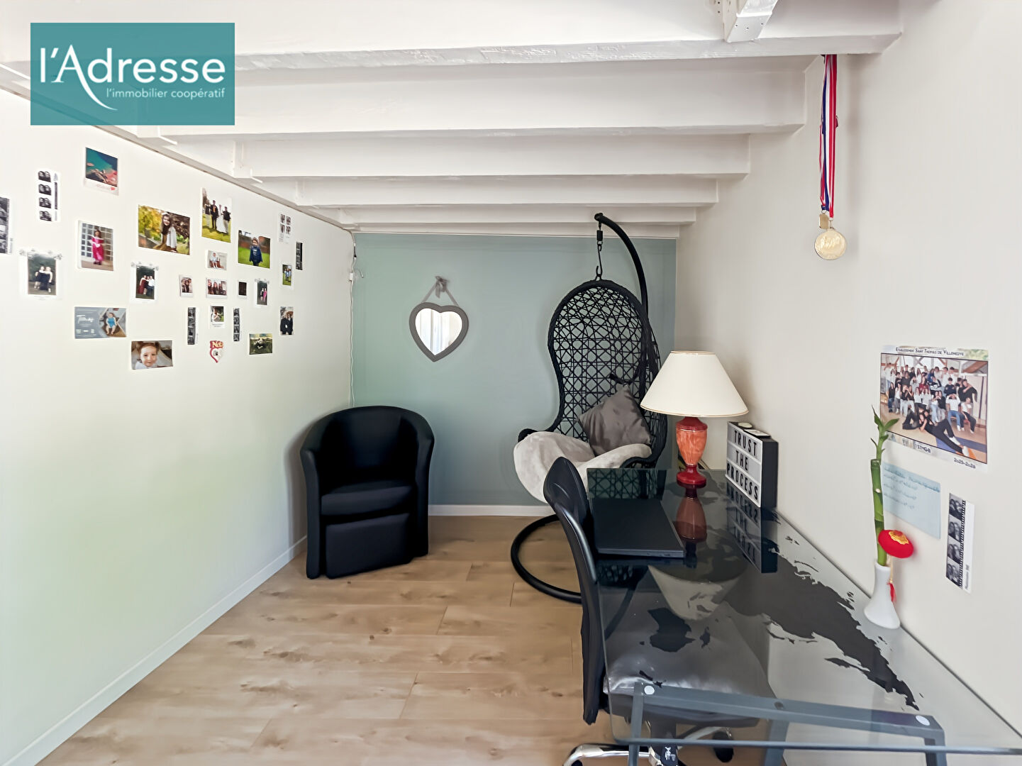 À l'étage, un palier dessert deux chambres, un dressing, une salle d'eau moderne avec toilettes, ainsi qu'une mezzanine polyvalente pouvant faire office de bureau, d'espace détente ou de chambre d'appoint.