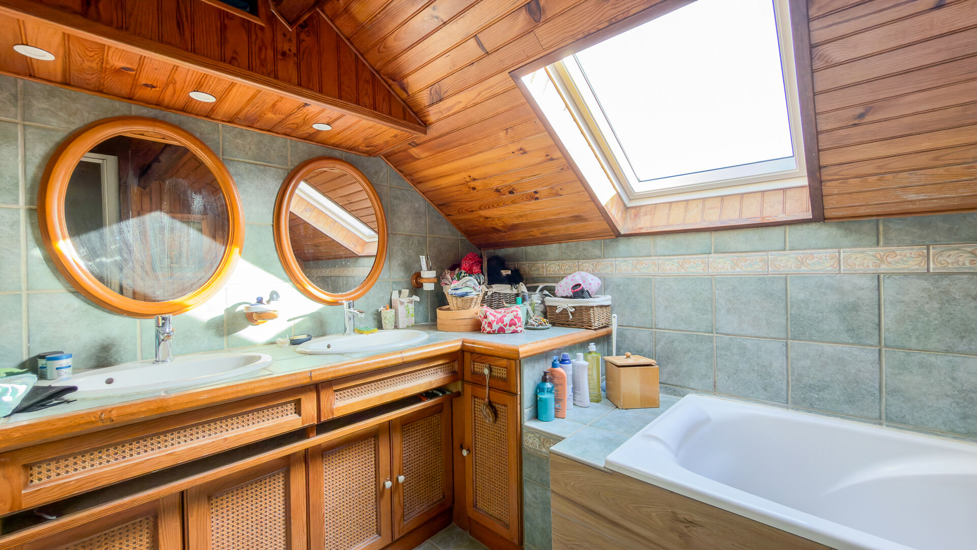 A l'étage: Palier, 3 chambres et une salle de bains avec baignoire, douche et wc.