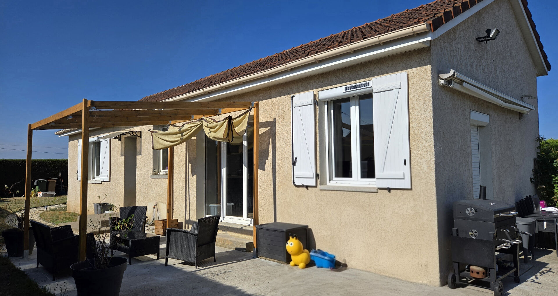 A l'extérieur une très belle terrasse avec sa pergola et un store banne pour profiter des beaux jours.