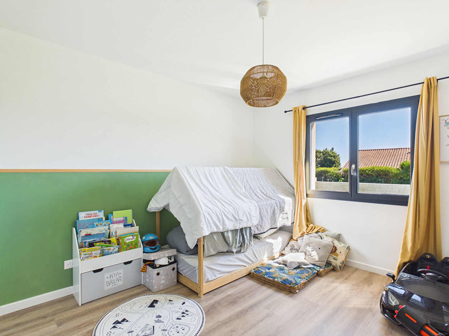 Côté prestations, vous profiterez d'un grand garage de 28 m² avec porte motorisée, de menuiseries aluminium en double vitrage avec volets roulants automatisés, d'un chauffage gainable avec climatisation, d'un chauffe-eau thermodynamique ainsi que de 12 panneaux photovoltaïques développant 6 kW. Les sols sont en carrelage côté jour et parquet flottant côté nuit apportent une finition soignée et actuelle.