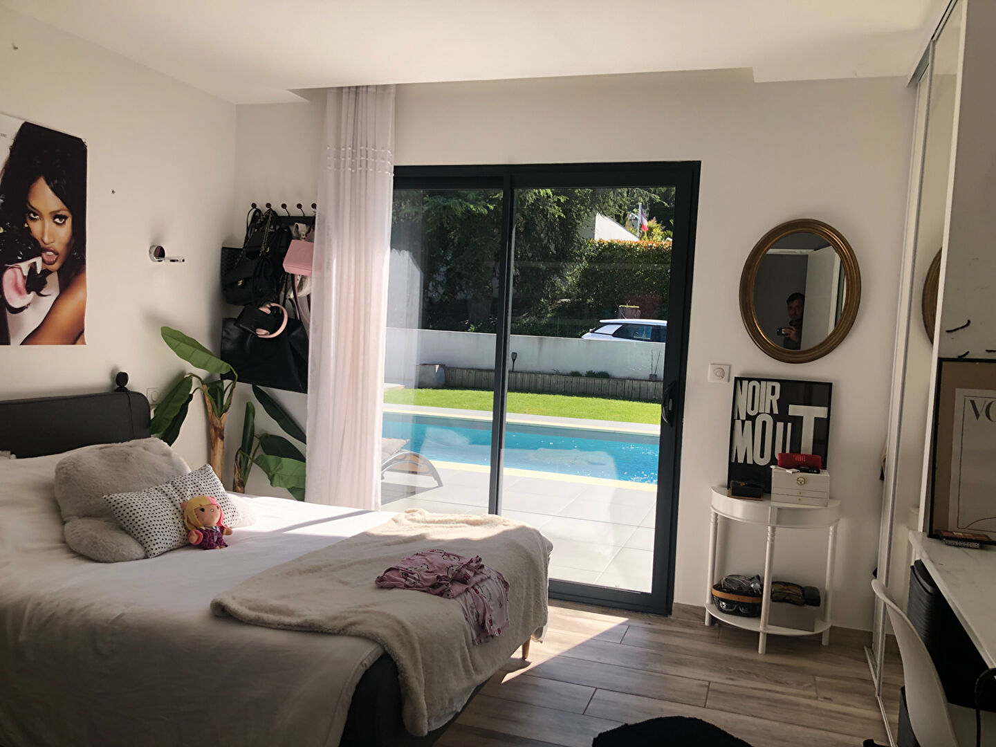 D'une surface d'environ 175 m², elle offre de beaux volumes avec cinq chambres, dont une suite parentale avec salle d'eau privative et dressing. L'espace de vie, baigné de lumière, s'ouvre sur une cuisine fonctionnelle, avec un accès direct à l'extérieur sur la terrasse et la piscine.
