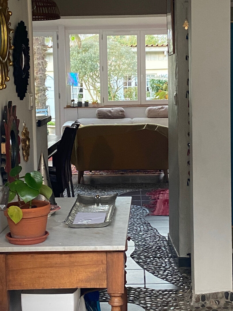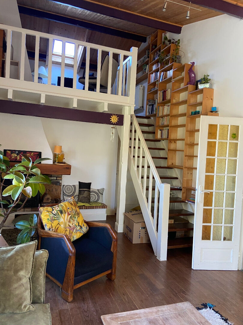 La maison principale développe des volumes généreux et une circulation fluide entre les espaces : cuisine aménagée, salle à manger, salon lumineux, bureau, second salon avec mezzanine, chambre de plain-pied, salle d'eau et wc.