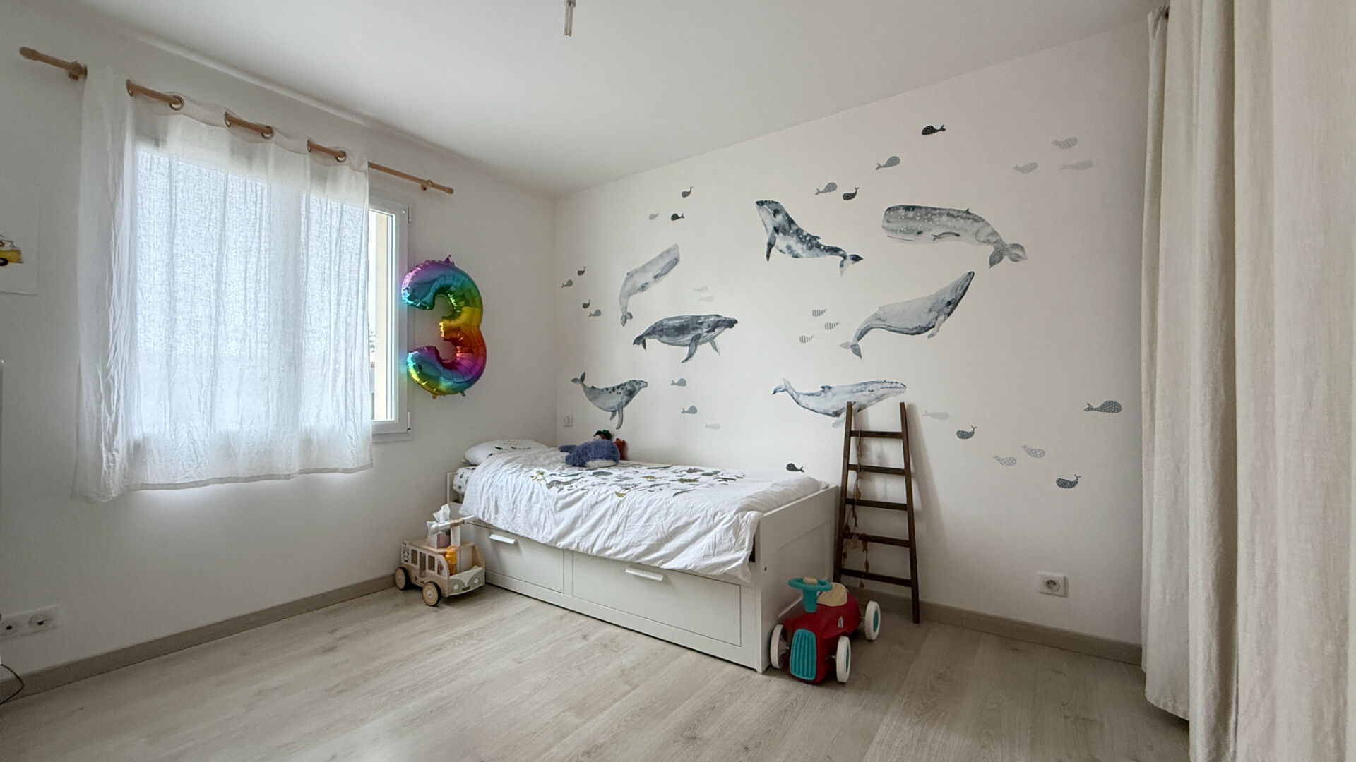 Elle dispose de 3 belles chambres, un bureau, une salle d'eau avec douche italienne, buanderie, garage avec faux grenier.