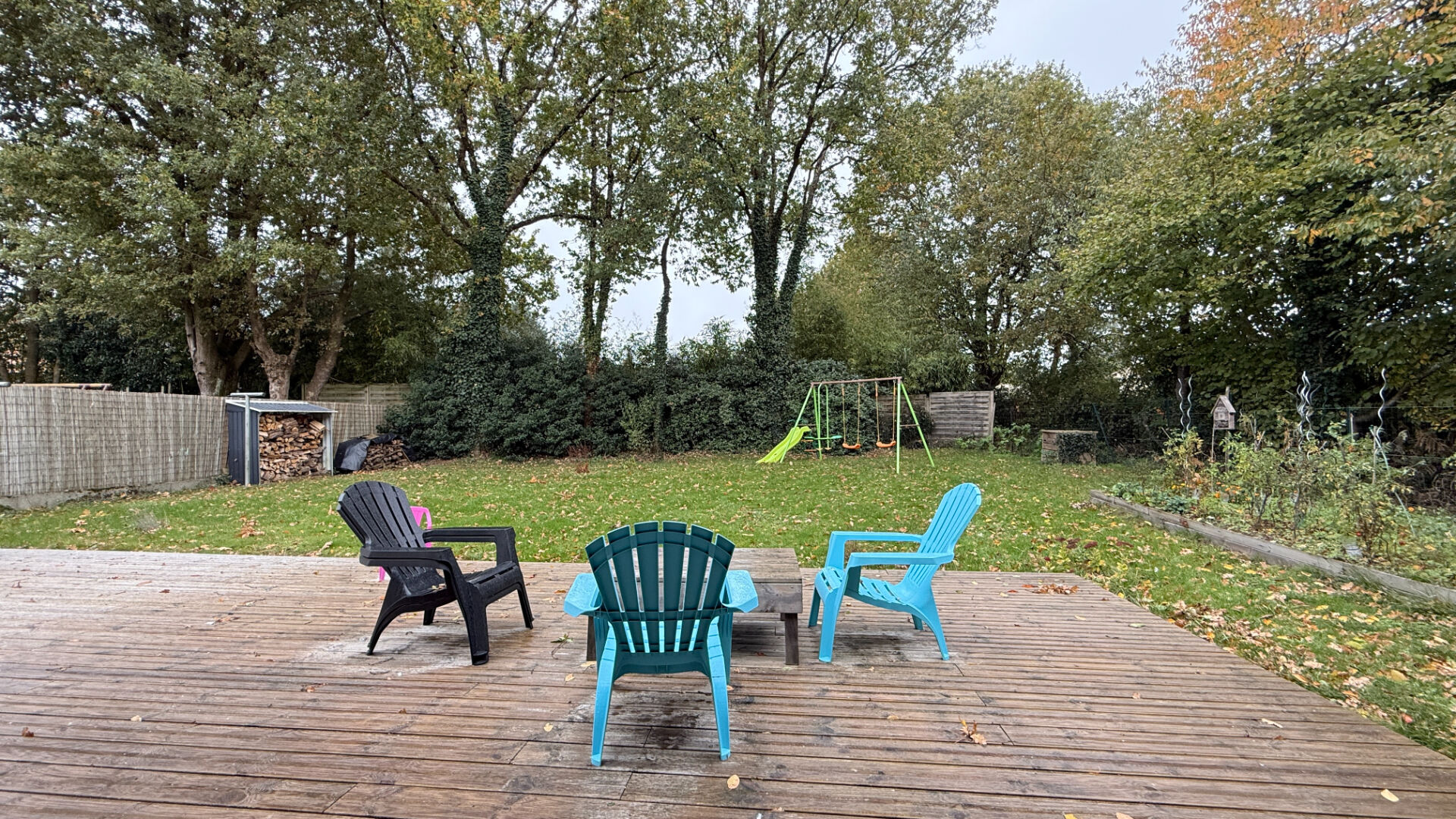 Charmante maison contemporaine de 2012 offrant une pièce de vie lumineuse de 41 m² avec cuisine aménagée et équipée, salon exposé sud-ouest et baie à galandage donnant sur un jardin de 583 m², poêle à bois pour des soirées chaleureuses.
