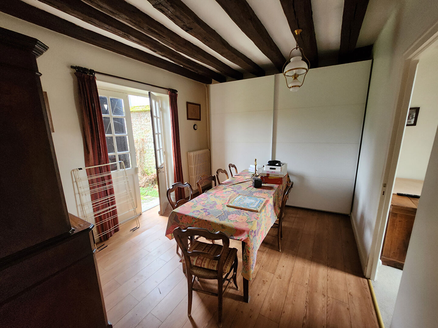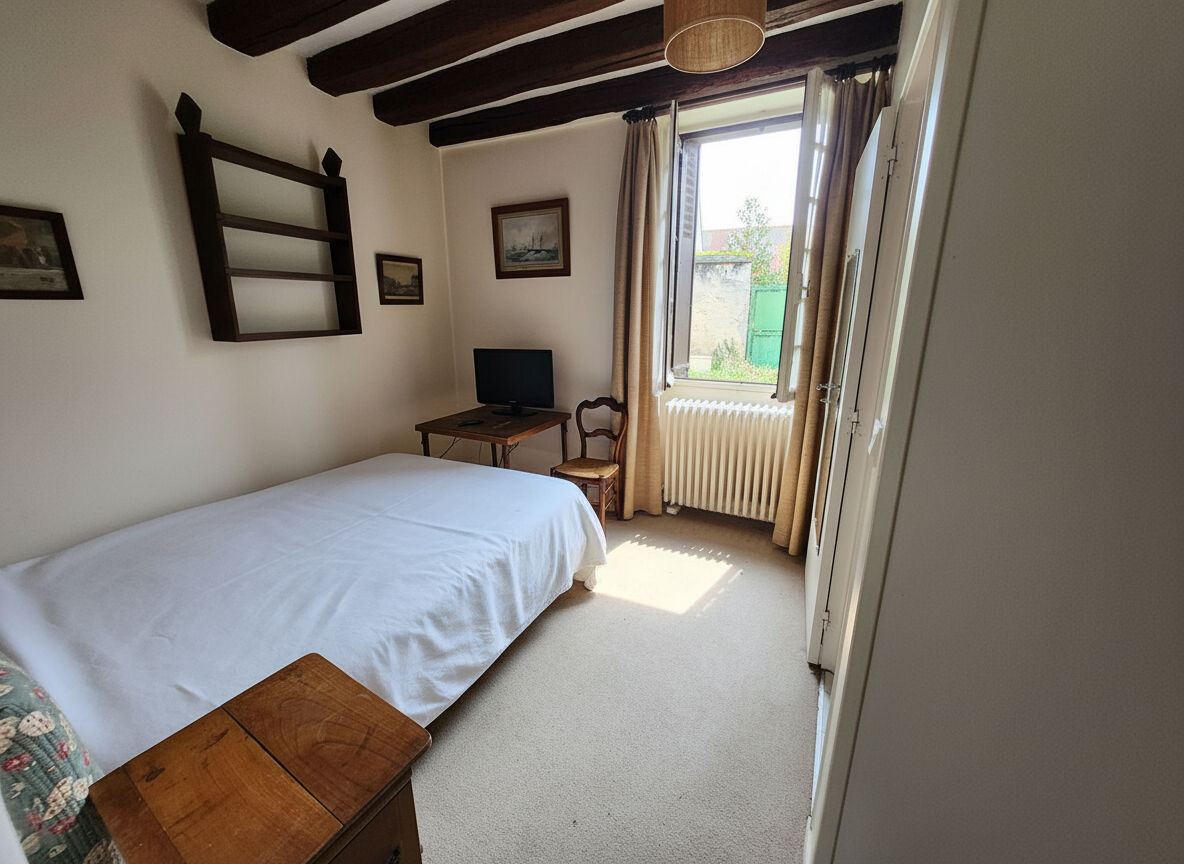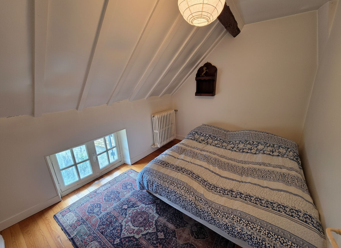 Au rdc belle pièce de vie avec poutres apparentes et cheminée ouverte, cuisine indépendante aménagée et équipée, salle à manger et une chambre de plain-pied avec sa salle d'eau. Wc.
