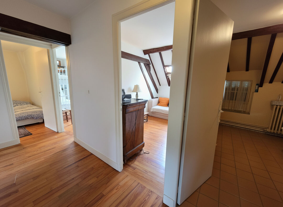 A l'étage le palier avec de grands placards, dessert 3 chambres et un bureau et la salle de bains avec wc (sanibroyeur).