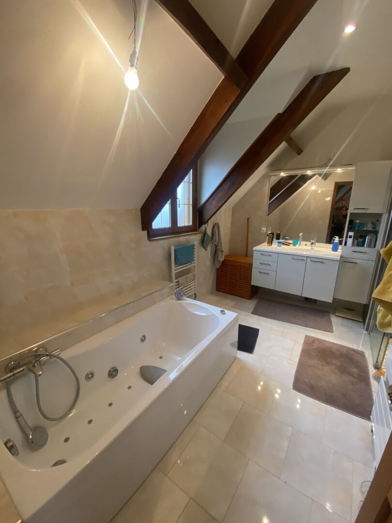 Salle de bains équipée d'une baignoire balnéo et d'une douche.