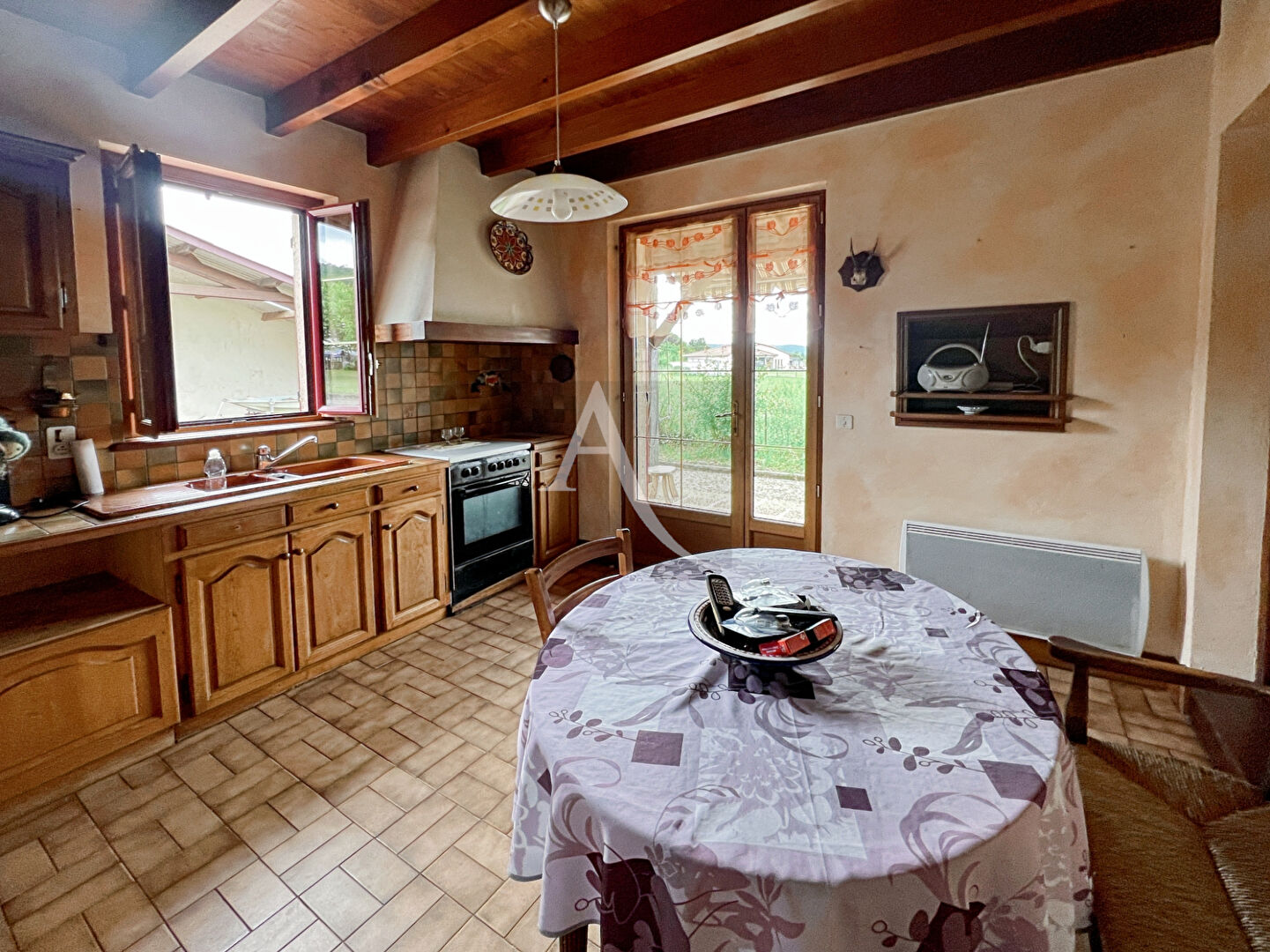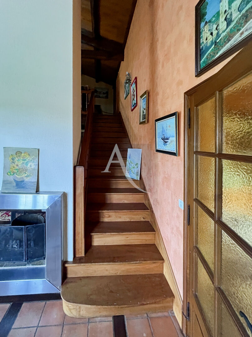 Maison qui offre de plain pied, une entrée sur une belle pièce de vie avec cheminée centrale, une cuisine aménagée ouverte sur un auvent, pour manger l'été ...