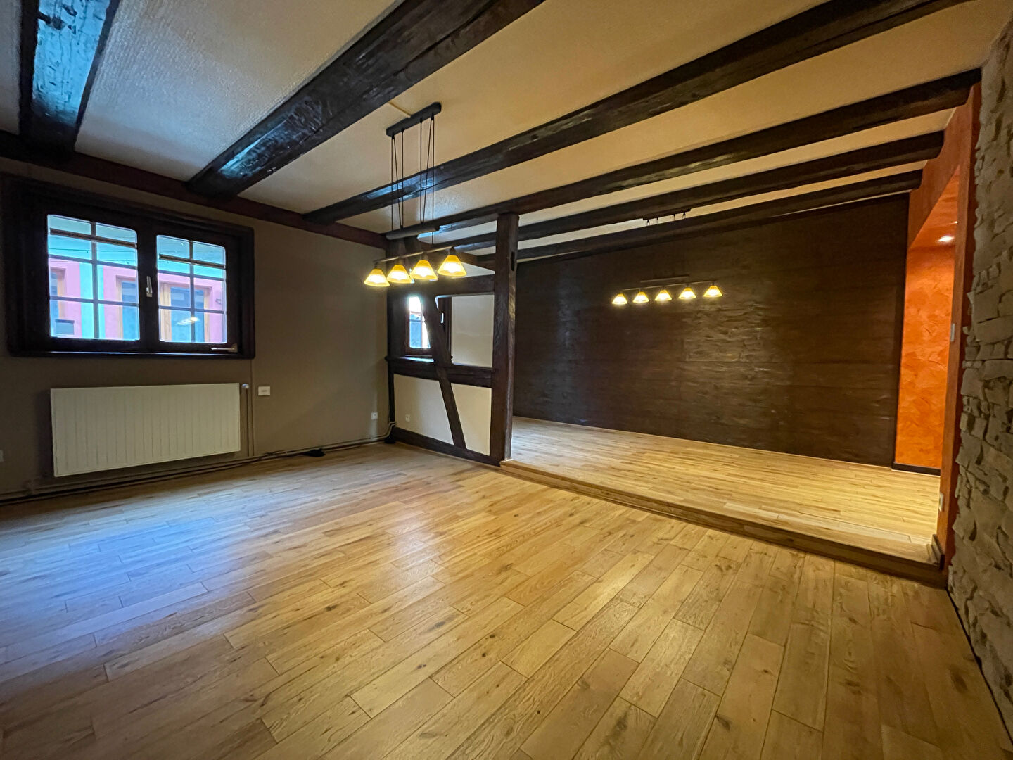 - Salon-séjour chaleureux avec colombages apparents.