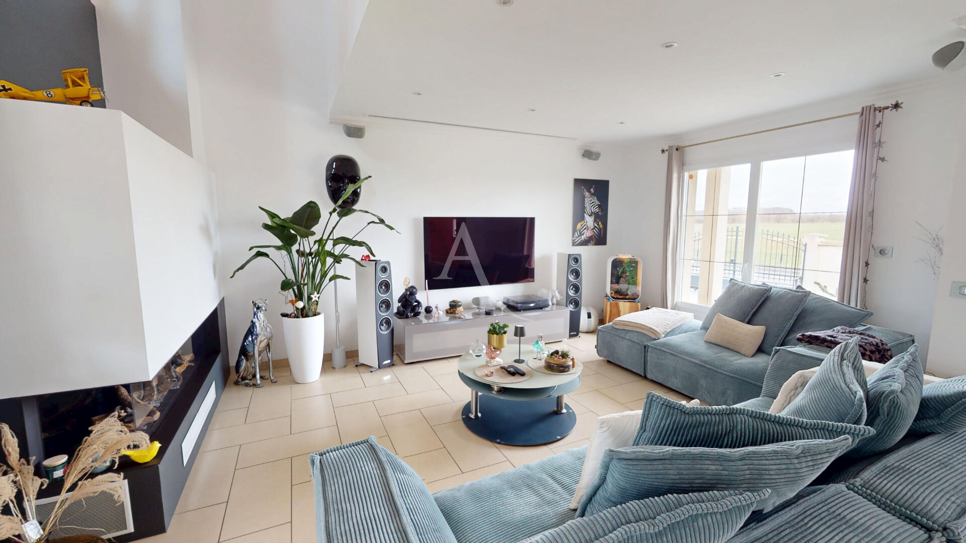 - La maison propose un espace ouvert de 65 m² réunissant salon, salle à manger et cuisine américaine. La cheminée contemporaine assure confort et chaleur, sans contraintes.