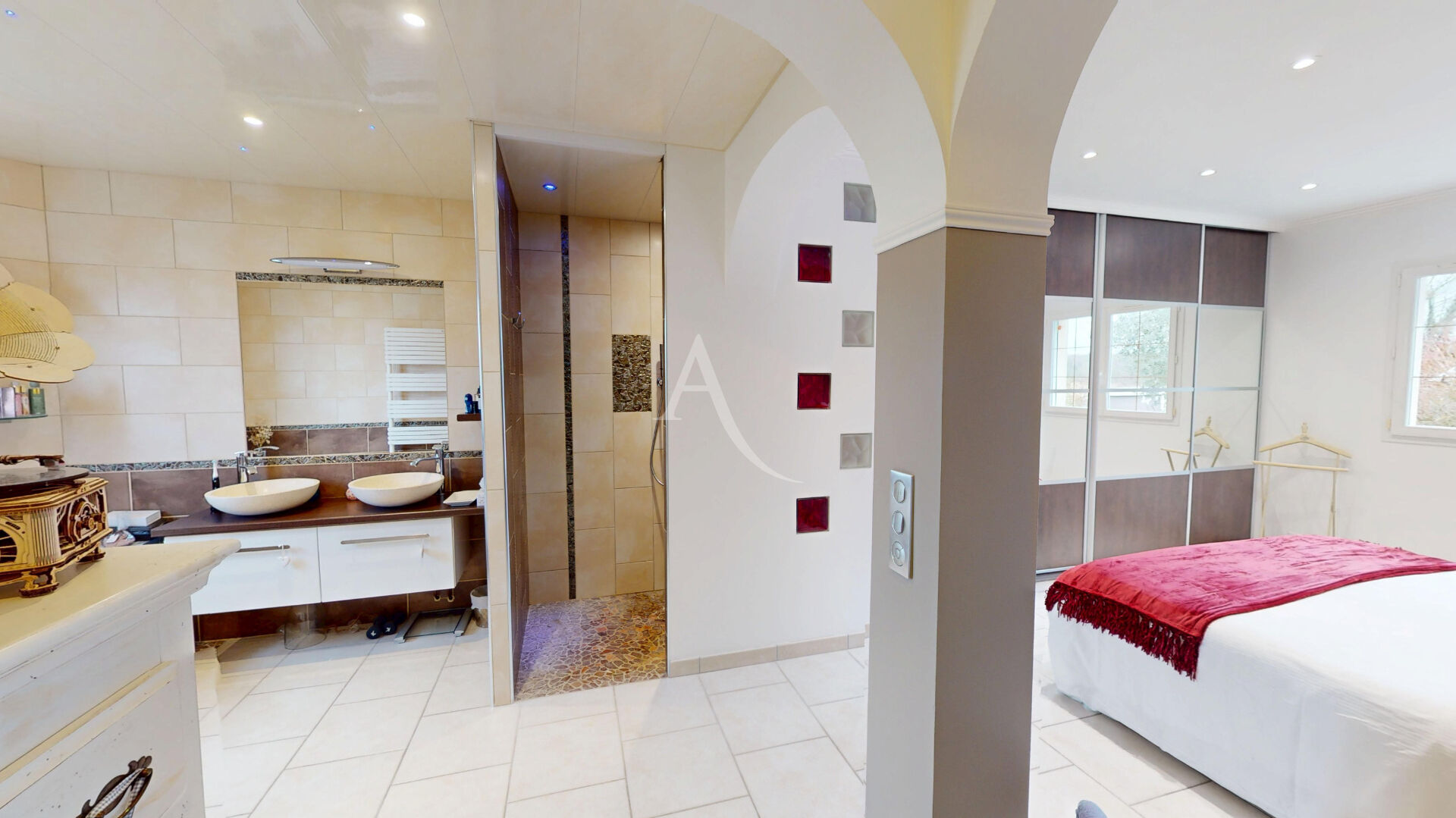 - Suite parentale au rez-de-chaussée avec dressing, baignoire balnéo, douche à l'italienne et double vasque. - À l'étage, trois chambres lumineuses, une salle d'eau avec WC et une mezzanine de 15 m², idéale en bureau, salle de jeux, espace gaming ou coin TV/détente.